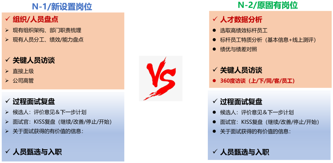 N-1/新设置岗位:因过往没有成熟的经验与案例参考,在前期需花费一些精力进行信息对称(招聘的目的、人才的要求等)和人才画像的梳理,以助力招聘目标的达成和精准有效地进行人员甄选。