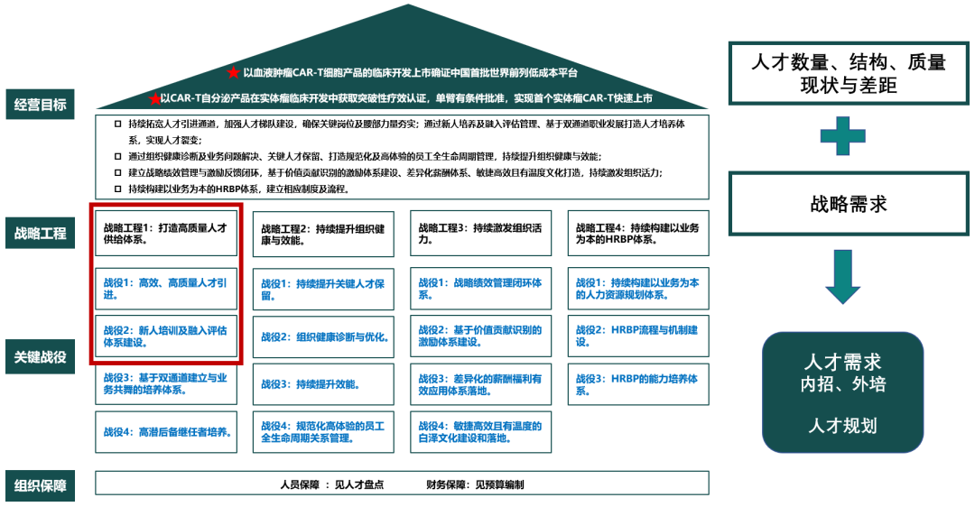 上海细胞引用阿里三板斧的逻辑打造了HRBP板块的人力资源规划(如图2),通过打造高质量人才供应体系、持续提升组织健康与效能、持续激发组织活力、持续构建以业务为本的HRBP体系四大战略工程推进工作,以实现经营目标。