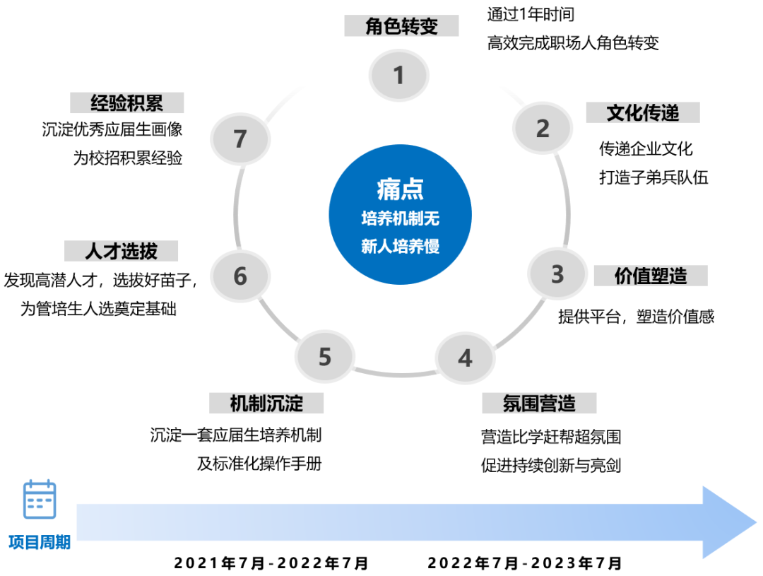 应届生在新员工中占比较重,也是重点培养对象,为此,上海细胞着手打造了专属于应届生的融入体系——白泽后浪计划(如图8),对应应届生一年的培养周期,帮助其完成从学生到职场人的身份转变。