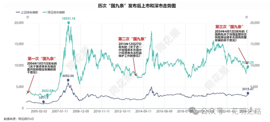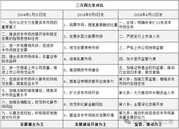 ?2004年和2014年“国九条”出台均解决了当时资本市场的一些症结。(1)2004年“国九条”主要解决了大量非流通股累积的股权分置等股市基础制度不完善的问题。一是2004年资本市场面临的背景是:大量非流通股长期累积、股权分置的矛盾较为突出,股市持续低迷。二是2004年“国九条”针对性的政策侧重在:积极稳妥解决股权分置问题、鼓励合规资金入市、重视资本市场投资回报。(2)2014年“国九条”主要解决了新兴行业公司上市和资金入市等问题。一是2014年资本市场面临的背景是:新兴行业大发展但上市公司较少、居民财富大幅增加但入市渠道有限。二是2014年“国九条”针对性的政策侧重在:加快多层次股权市场建设、鼓励市场化并购重组、培育私募市场、加快建设金融期货市场,扩大资本市场开放。