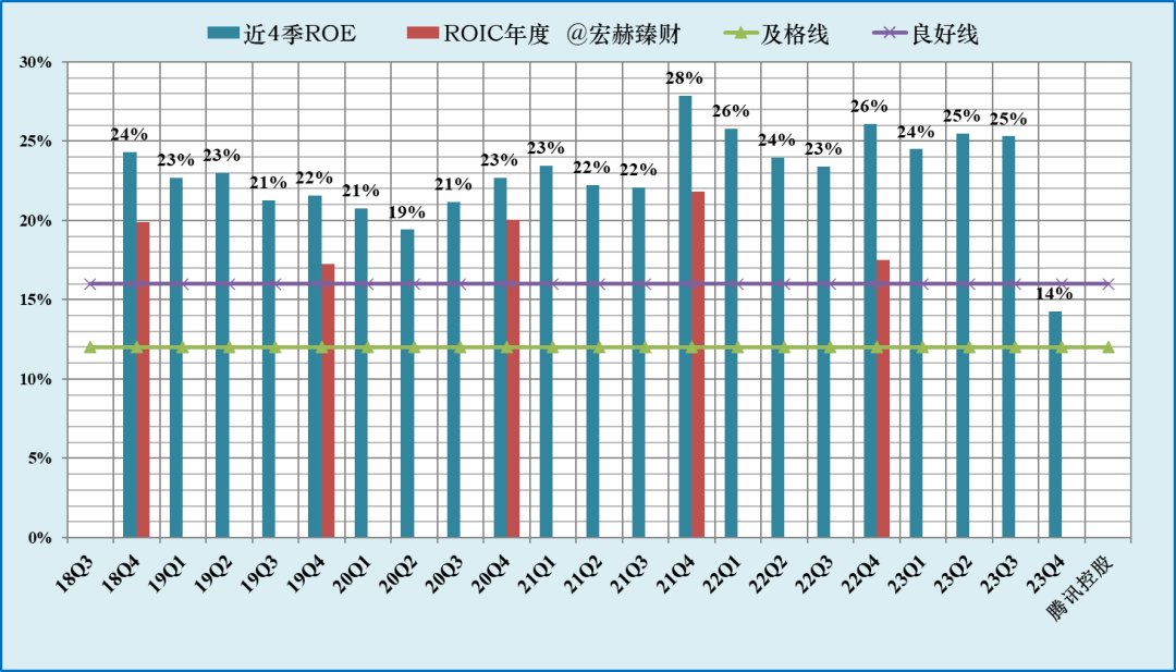 按国际准则计,腾讯的ROE在23Q4走至良好线下方。