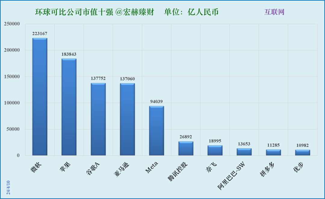 参照行业为互联网的当前可比公司共计32家,当前时点该行业市值最高为美国的微软,市值22.32万亿人民币。中位数市值2605亿。所有可比公司估值(市盈率)中值:21倍;
