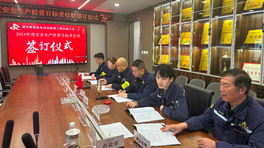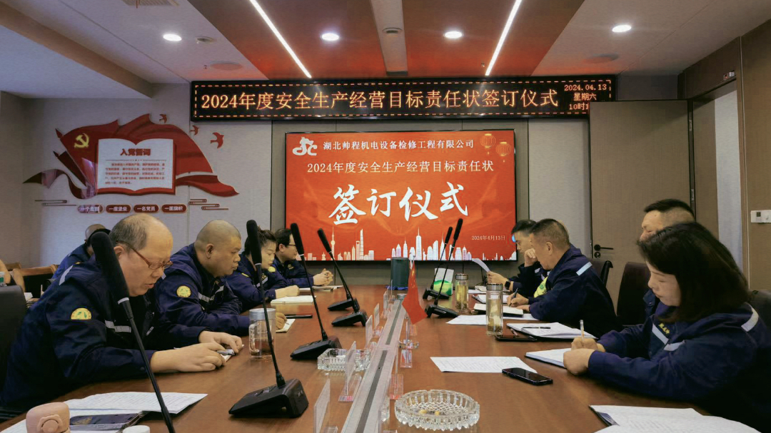 2024年4月13日,湖北帅程机电设备检修工程有限公司组织召开了以“立足新起点,开启新征程,实现新作为”为主题的年度生产经营目标责任状签订大会。公司各级领导、各部门、事业部及作业区负责人齐聚一堂,共同见证这一重要时刻。整个仪式现场布置简约而庄重,签约台上整齐摆放的责任状文件,象征着责任与承诺。