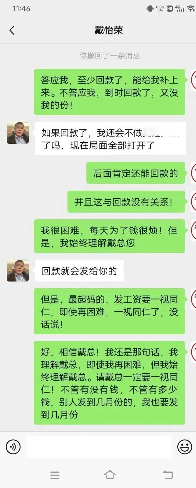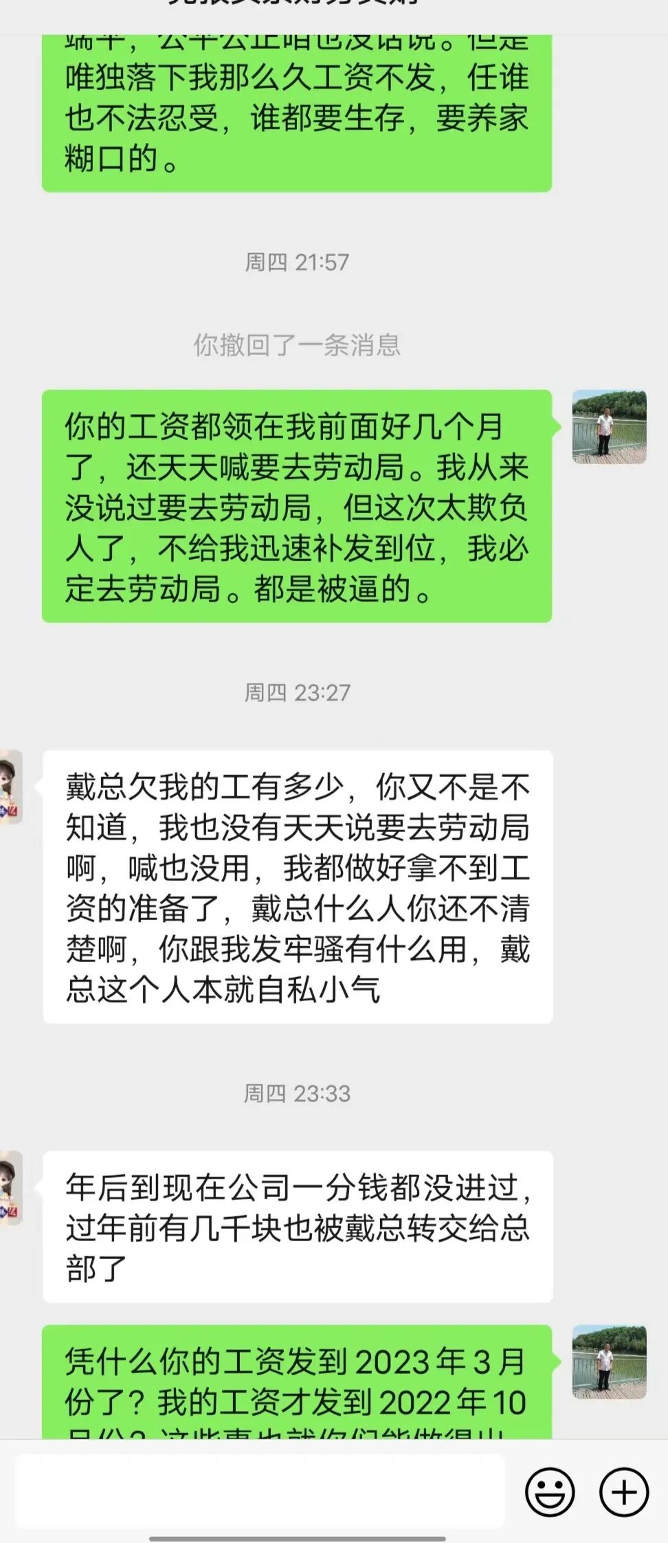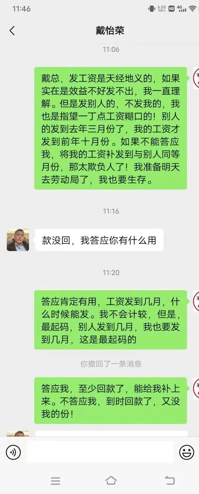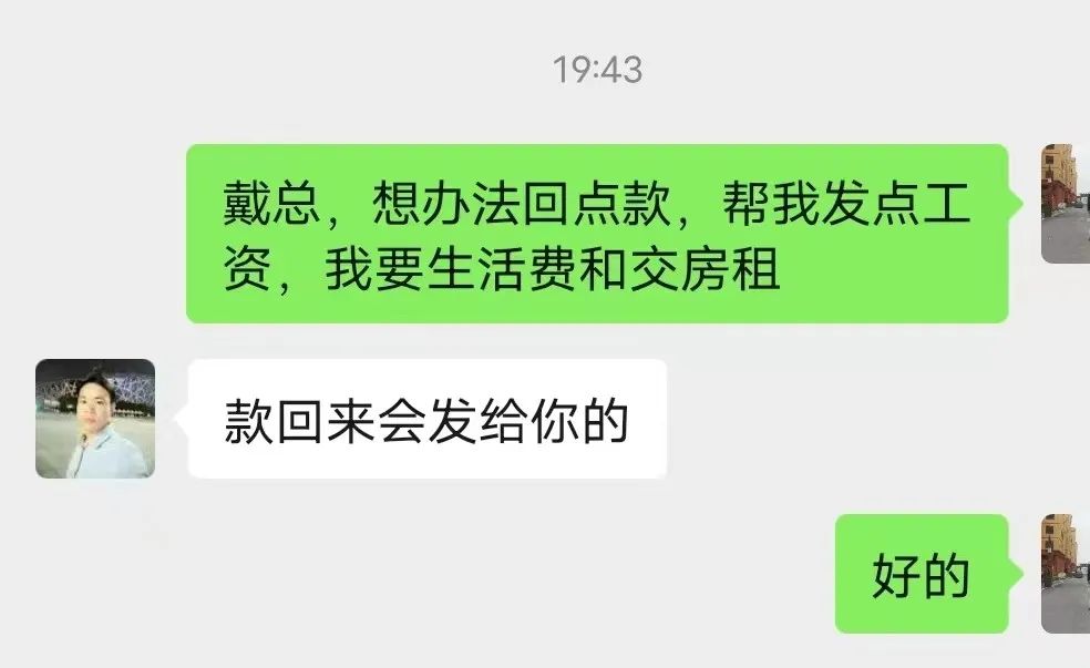 工作一直做到2024年4月初,我的工资才发放到2022年10月份,每次催问工资,戴怡荣都哭穷,说他比员工还困难,都是说公司没有回款,回款了就发。让人极其气愤的是,直到2024年4月份初我才发现,老板戴怡荣自己的工资和另外一名员工(公司财务)的工资早在去年年底已经瞒着我偷偷地发放到2023年4月份!于是我强烈要求戴怡荣下次回款之后,一定要把我的工资补发到2023年3月份,可是戴怡荣连这最起码的请求都难以做到。更可恶的是,2024年4月13日至14日期间,公司对公账户进账上万元,戴怡荣仍然未给我发放一分钱工资!是可忍孰不可忍!