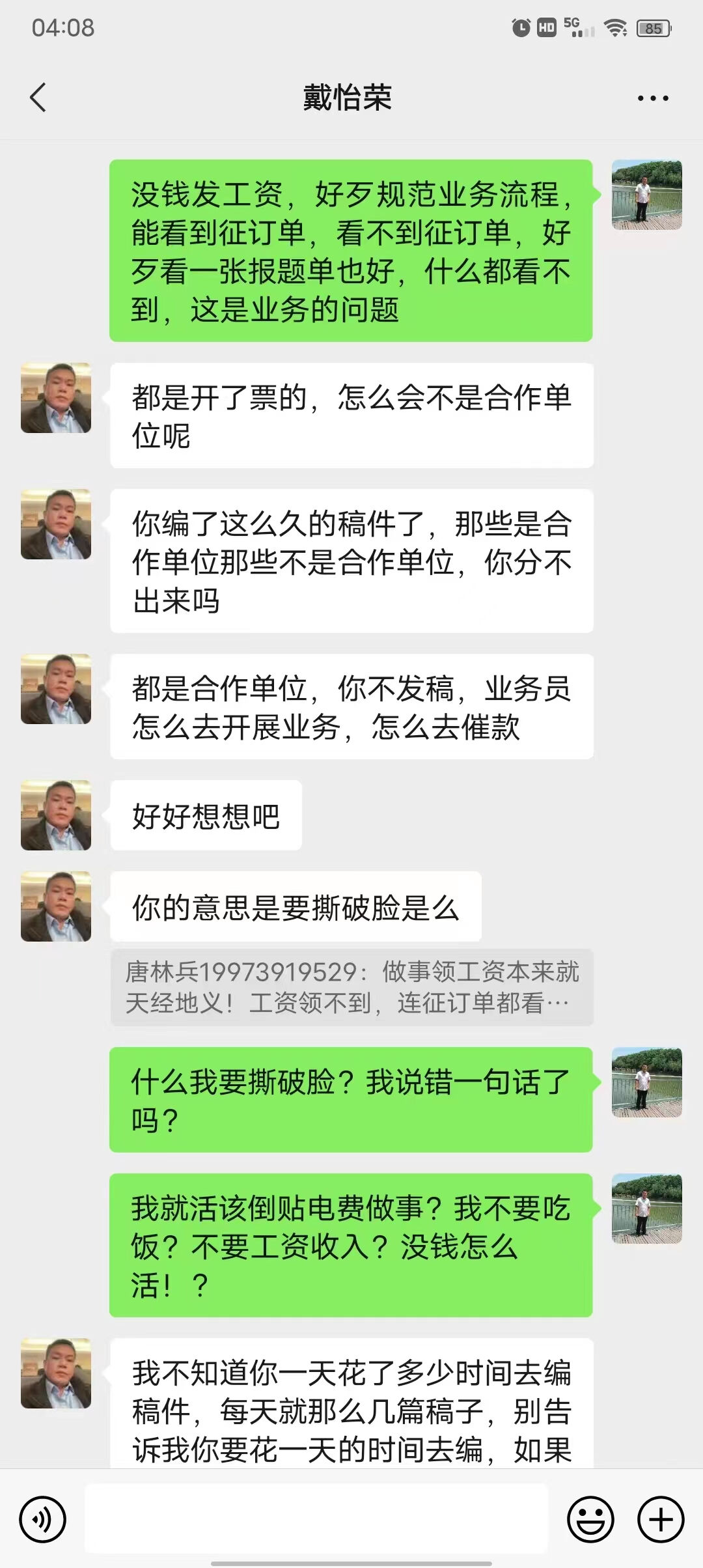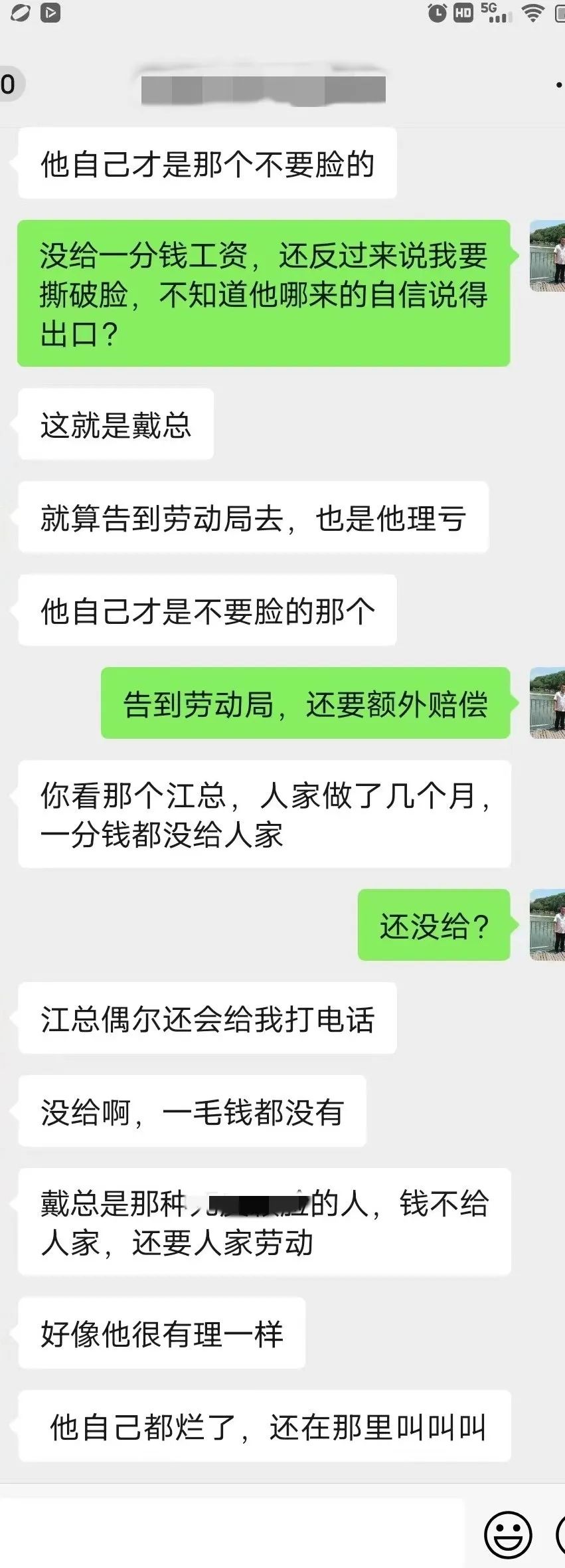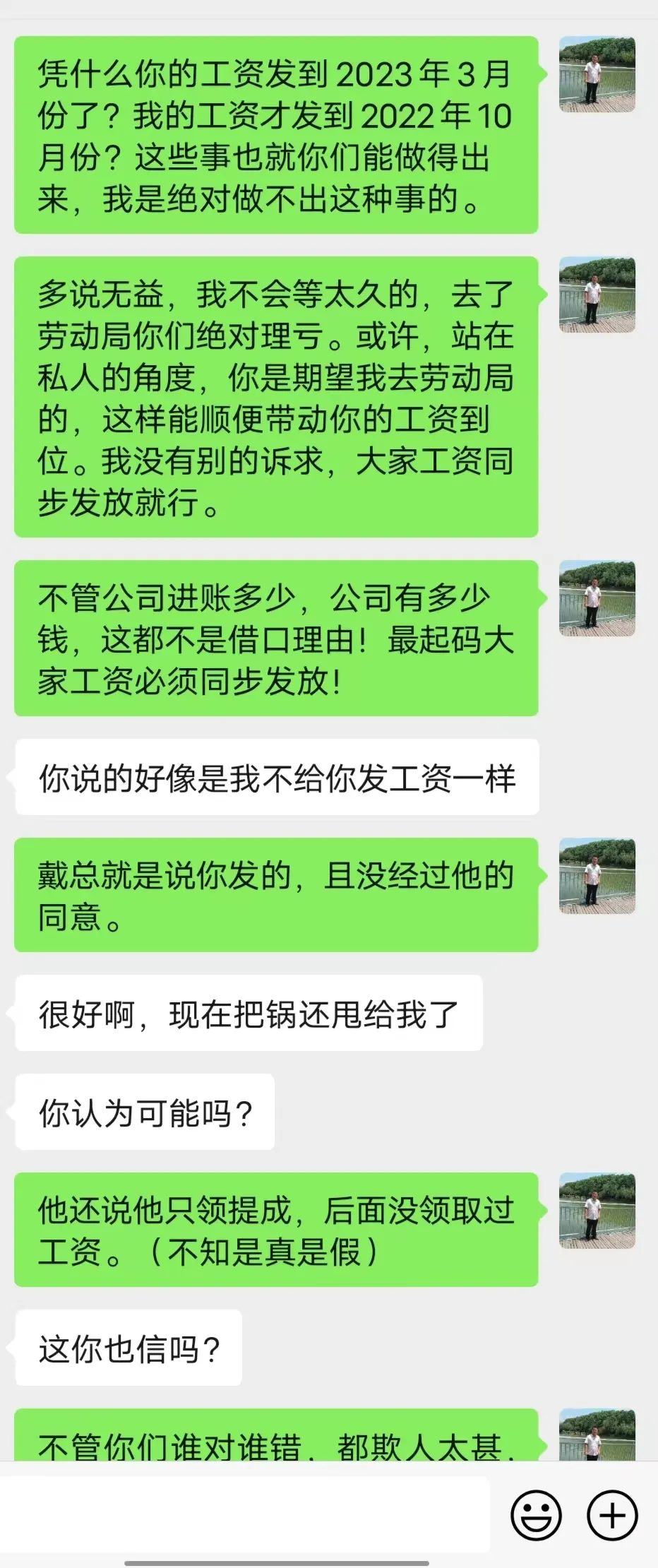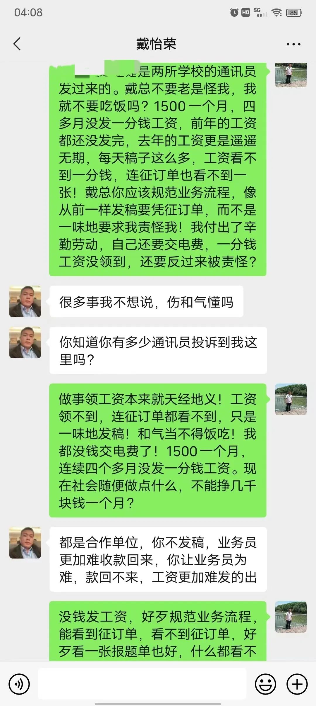 工作一直做到2024年4月初,我的工资才发放到2022年10月份,每次催问工资,戴怡荣都哭穷,说他比员工还困难,都是说公司没有回款,回款了就发。让人极其气愤的是,直到2024年4月份初我才发现,老板戴怡荣自己的工资和另外一名员工(公司财务)的工资早在去年年底已经瞒着我偷偷地发放到2023年4月份!于是我强烈要求戴怡荣下次回款之后,一定要把我的工资补发到2023年3月份,可是戴怡荣连这最起码的请求都难以做到。更可恶的是,2024年4月13日至14日期间,公司对公账户进账上万元,戴怡荣仍然未给我发放一分钱工资!是可忍孰不可忍!
