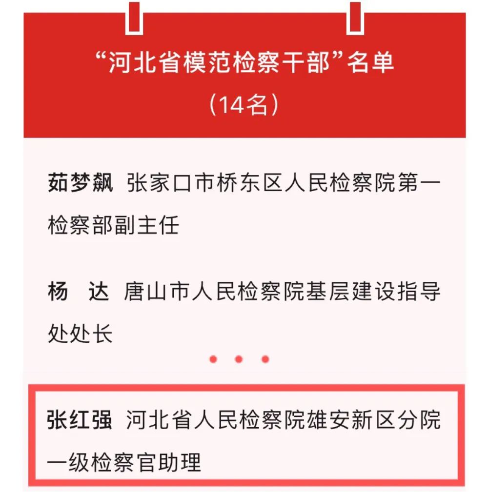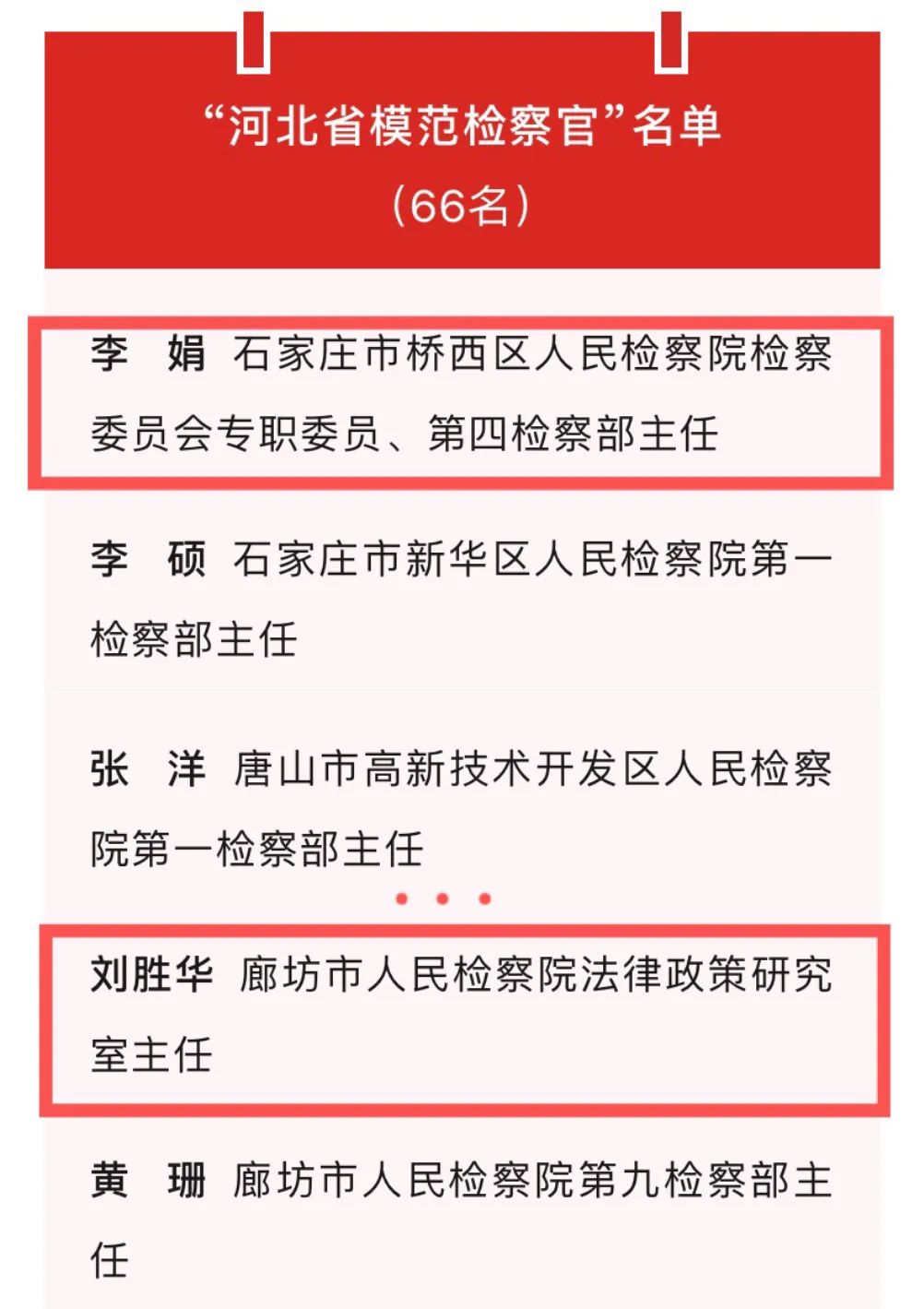 近日,河北省人力资源和社会保障厅、河北省人民检察院发布《关于表彰河北省模范检察院、模范检察官和模范检察干部的决定》,授予11个基层人民检察院“河北省模范检察院”称号,授予66名同志“河北省模范检察官”称号,授予14名同志“河北省模范检察干部”称号。我校校友,1997届毕业生、石家庄市桥西区人民检察院检察委员会专职委员、第四检察部主任李娟,2003届毕业生、廊坊市人民检察院法律政策研究室主任刘胜华荣获“河北省模范检察官”称号 ;2010届毕业生、河北省人民检察院雄安新区分院一级检察官助理张红强荣获“河北省模范检察干部”称号 。
