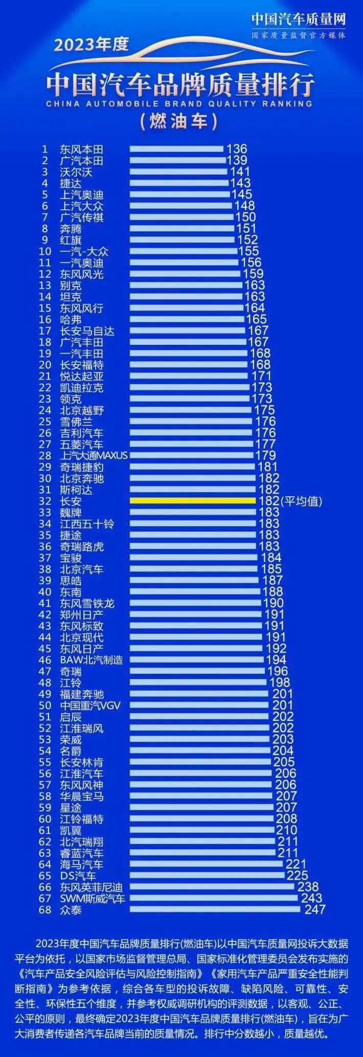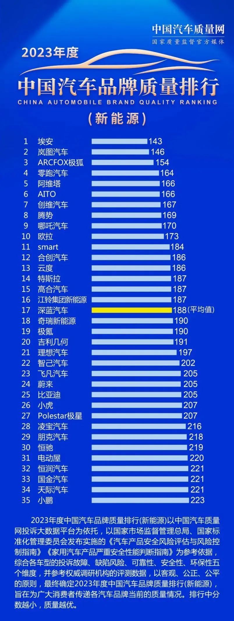 如今,市场上的产品越来越多,消费者该如何选择呢?中国汽车质量网发布的《2023年度中国汽车品牌质量排名》,或许能给你参考。该榜单是由国家质量监督官方媒体主导,以中国汽车质量网投诉大数据平台为依托,以国家标准为参考依据,综合投诉故障、缺陷风险、可靠性、安全性、环保性五大维度对车辆进行评选,数值越小代表质量越好。