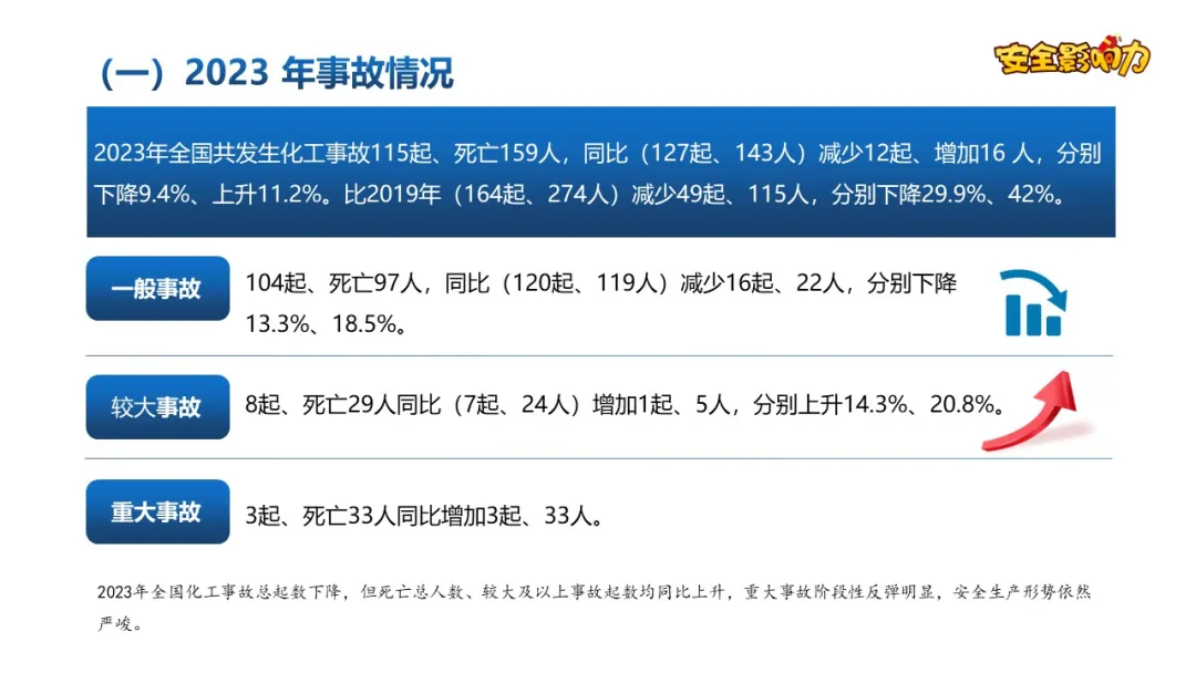 2023年,轻工、纺织行业共发生生产安全事故286起、死亡284人(不含火灾、特种设备、建设工程事故),其中轻工行业发生事故244起、死亡243人,纺织行业发生事故42起、死亡41人。轻工、纺织行业共发生较大事故6起、死亡23人。其中轻工行业5起、死亡20人,纺织行业1起、死亡3人。