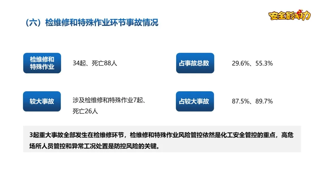 辅助生产工艺中事故起数居首位的是设备检维修作业,主要是由于设备检维修作业多为临时作业,作业场所、作业人员、施工工艺和方法不固定,没有预先制定作业安全方案,机械设备危险能量控制措施不足,作业前安全技术交底不充分,“三违”现象屡有发生。