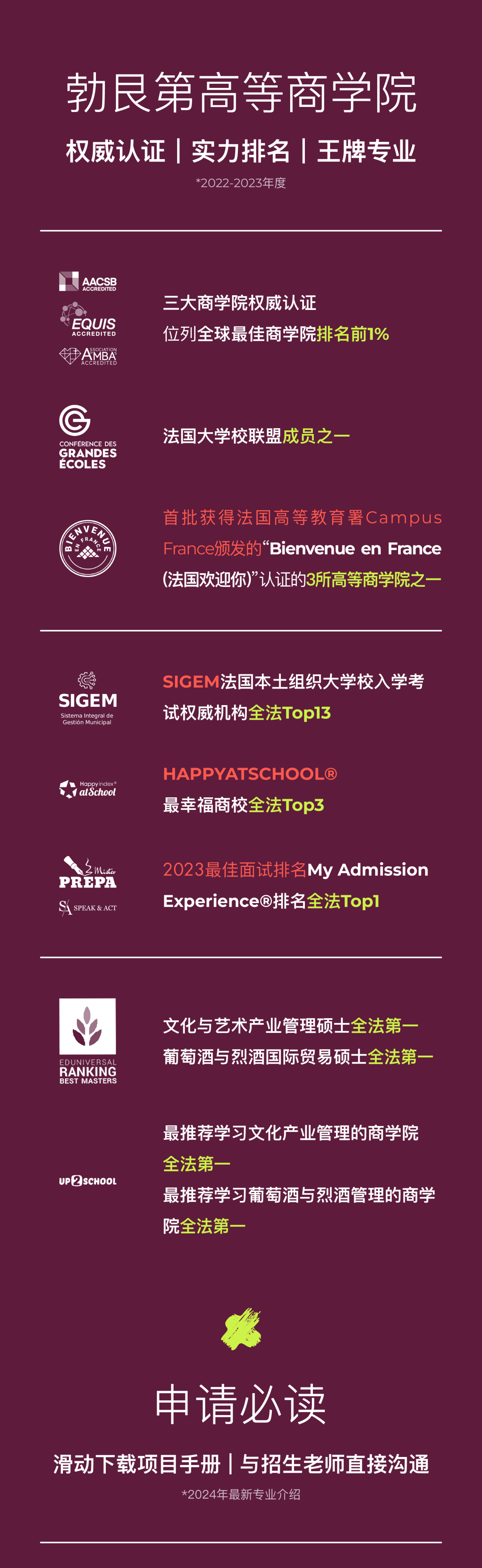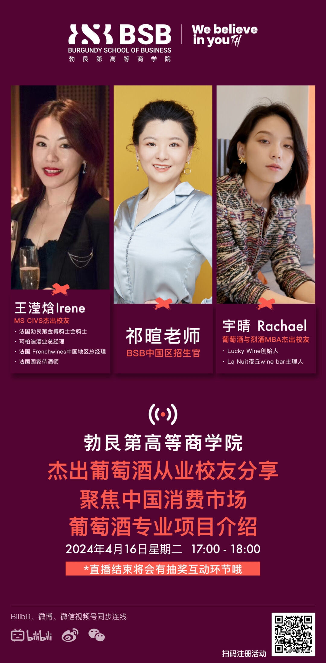 除了招生负责人祁老师之外,这次的二位校友来自SWSB葡萄酒与烈酒学院的不同项目,分别是MS CIVS葡萄酒与烈酒国际贸易硕士(全法#1&全球#3)和葡萄酒与烈酒MBA,从选择法国留学到回国创业,二位都有自己独特的经历和对行业的理解。她们将对中国葡萄酒行业现状和的不同位置分享自己的一手经验~