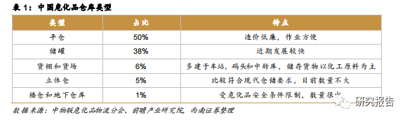 我国危化品仓库主要有 7 种基本类型,即平仓、楼仓、立体仓、储罐、货棚、货场和地 下半地下仓库。据前瞻产业研究院统计,目前我国平仓所占比例较大,储罐约占总量的 38%。