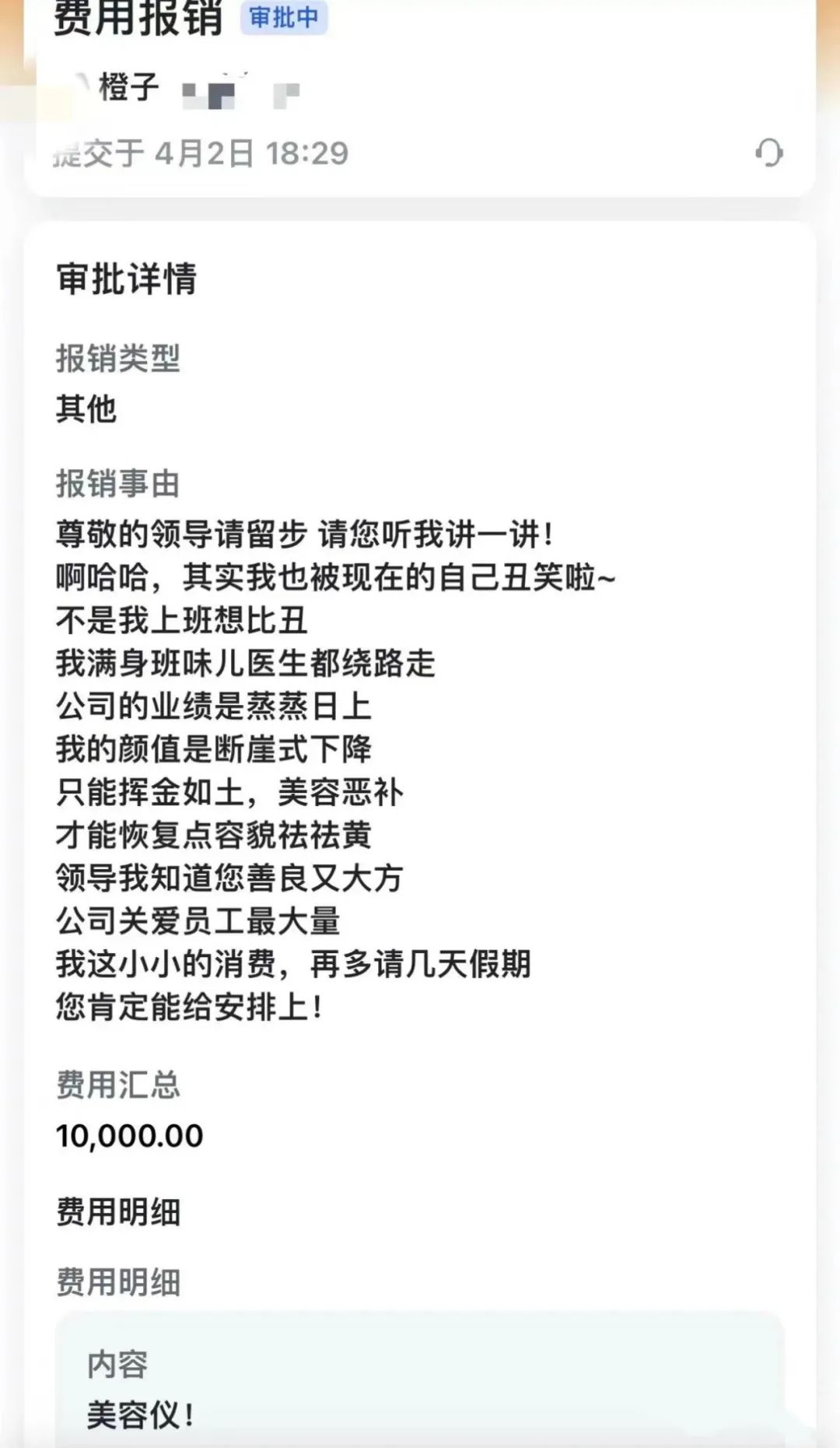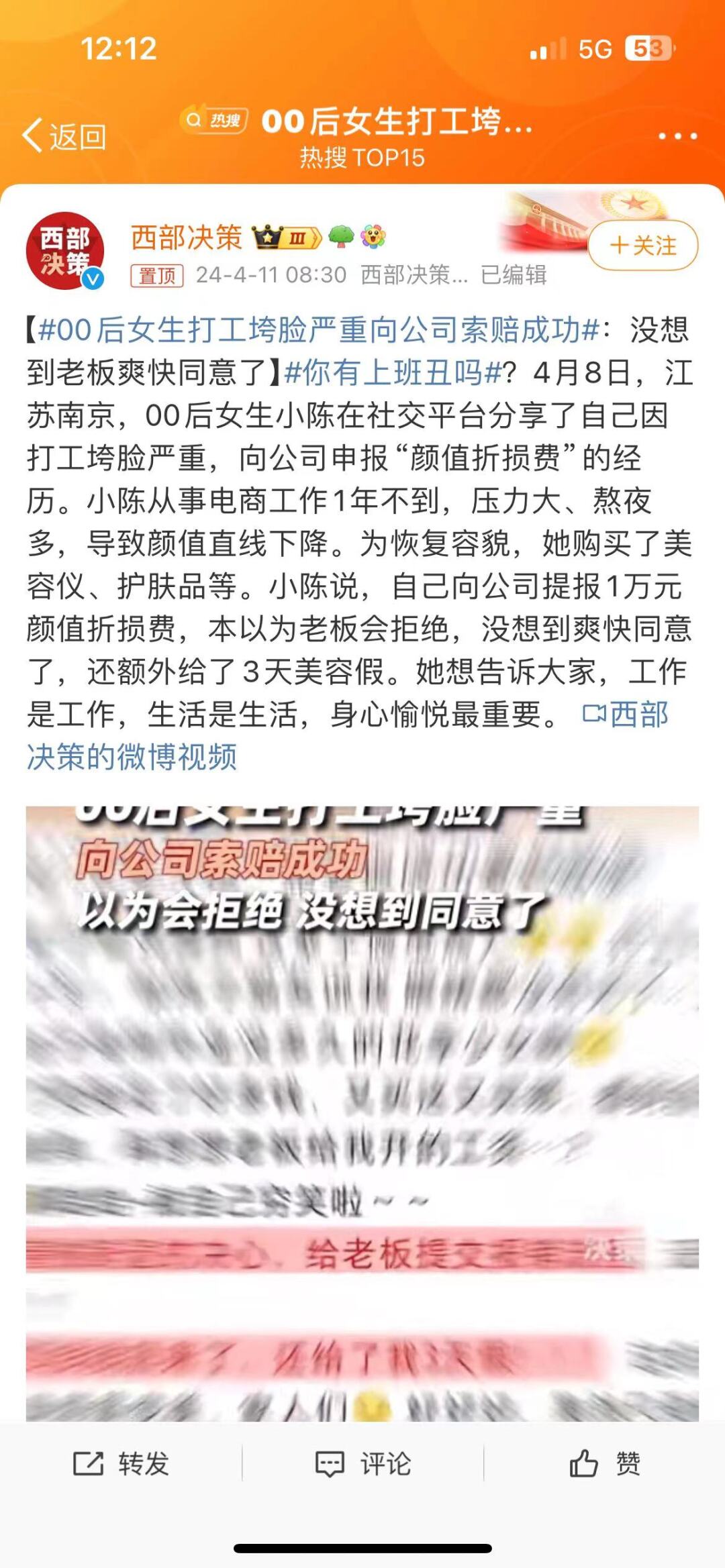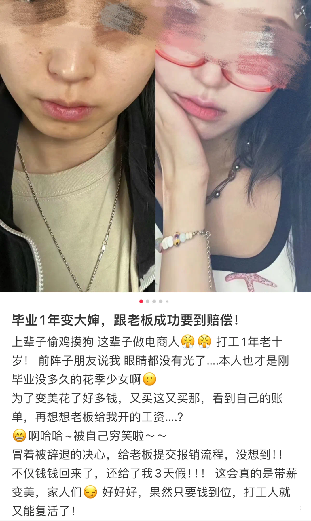 4月8日,江苏的00后女生小陈在社交平台分享了自己因打工垮脸严重,向公司申报“颜值折损费”的经历。小陈从事电商工作1年不到,压力大、熬夜多,导致颜值直线下降。为恢复容貌,她购买了美容仪、护肤品等。