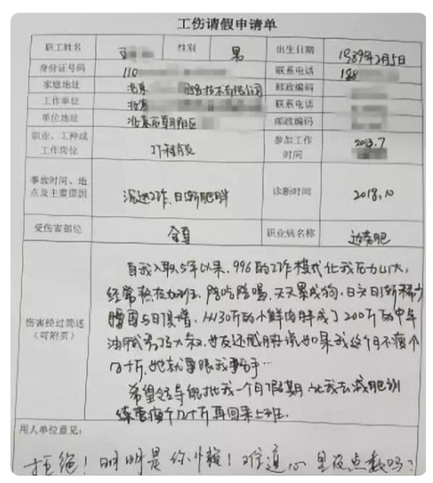 早在 2018 年时,网上就疯传过一张工伤申请单,但当时引起大家热议的主要原因,是这张申请单上的申请原因,写着“过劳肥”。