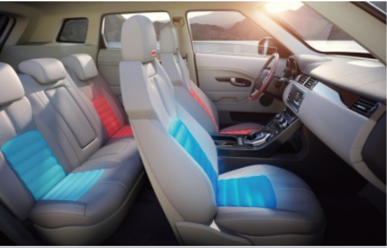 风扇送出的气流通过与器件表面接触后,成为冷风或热风。冷风或热风导入座椅底座和靠背,从座椅表面透出,以达到制冷/制热的效果。