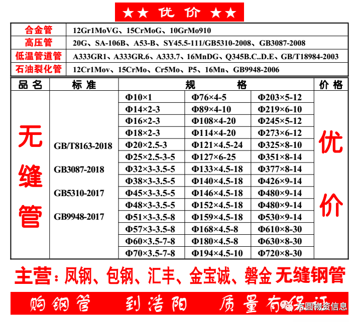 我公司销售代理凤钢、包钢、汇丰、金宝诚、磐金等钢厂产的无缝钢管,钻探/地质管/注浆/隧道管焊接/无缝管件,数控锯床,切割开零;以价格优惠,规格齐全,货源充足,产货及时,服务周到著称。我公司可根据用户的需要的定做各种非标管、合金管、石油裂化管、流体管、锅炉管、特殊用途管、机加工用管。欢迎新老客户来电垂询!