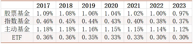 从日本来看,极低利率之下,尽管存款零利率,但由于其他资产回报率低,日本居民配置存款占比明显偏高。极低利率使得固收类基金发展走下坡路,股票基金规模明显增长。只不过股票基金面临指数化及ETF化的大趋势,费率长期下行,财富管理业务发展面临较大的挑战。