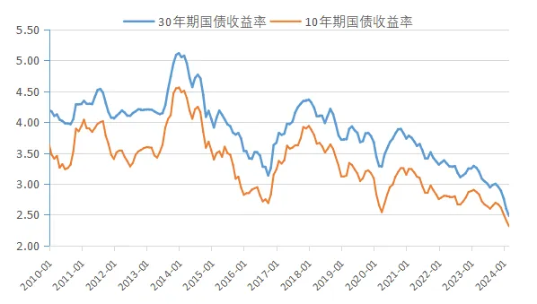 债券收益率已降至历史低位。2010年以来,随着经济增长换档,我国各类债券收益率趋势性下行,如图1所示,10年期国债收益率从2010年初的3.6%降至2024年3月的2.3%,与此同时,30年期国债收益率从4.2%逐步降至2.5%。近几年来,债券市场的信用利差显著下降,期限利差明显压缩。尤其是近五年,债券收益率大幅下行。