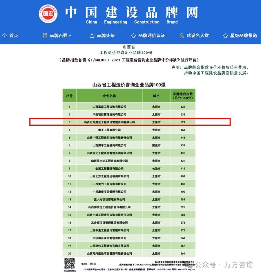 《世界财经》杂志(全球发行期刊)、建设品牌网.中国(WWW.CECB.org.cn)、CEBC中国建设传媒集团(中国首家工程建设品牌国际传播机构)、C1TV建审传媒、建新国际通讯社(城市建设国际通讯社)及80余家海内外媒体联合发布《山西省工程造价咨询企业品牌100强》名单。山西万方建设工程项目管理咨询有限公司以529的品牌综合指数评分荣获其列。