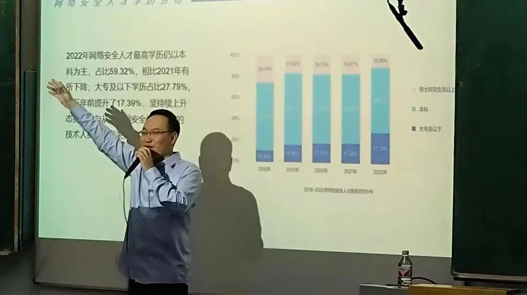 孙维伯结合自身发展经历,从网络安全行业现状、网安行业与职业规划、安全企业赛道与挑战、对大学生的一些建议四个方面进行了讲座。他详细讲解了当前国际网络安全发展现状、网络安全人才培养及我国技术领域的发展现状。并结合实际工作案例,就计算机专业的大学生如何看待考研与就业、如何写简历、为什么学好大学课程等问题进行了深入思考与交流。最后鼓励同学们看清发展方向,大胆探索未来,扎实学好大学课程,做好今天的自己,才能抓住机遇成就未来的自己。院长张光华主持讲座,他希望同学们,学好专业,坚守法律底线,为国家网安事业做出贡献,同时,张院长还表示学校拥有多种渠道可供同学们了解网络安全相关知识。