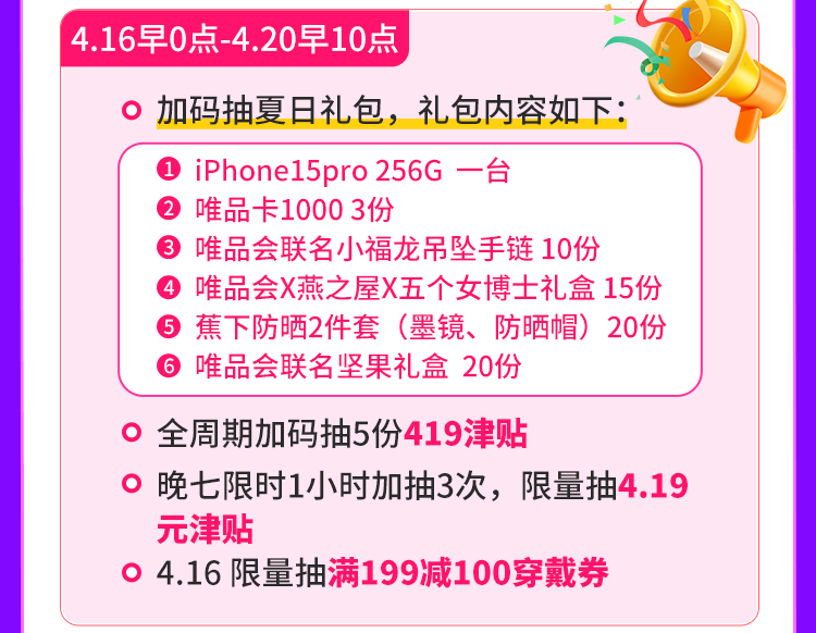 第二波(4月16日早上0点至4月20日早上10点):全周期加码抽419元津贴和“夏日礼包”(包括iphone15pro 256G一台,唯品卡1000三份等),每天19点至20点加3次抽奖机会,限量抽4.19元津贴,以及4月16日限量抽满199减100穿戴券。