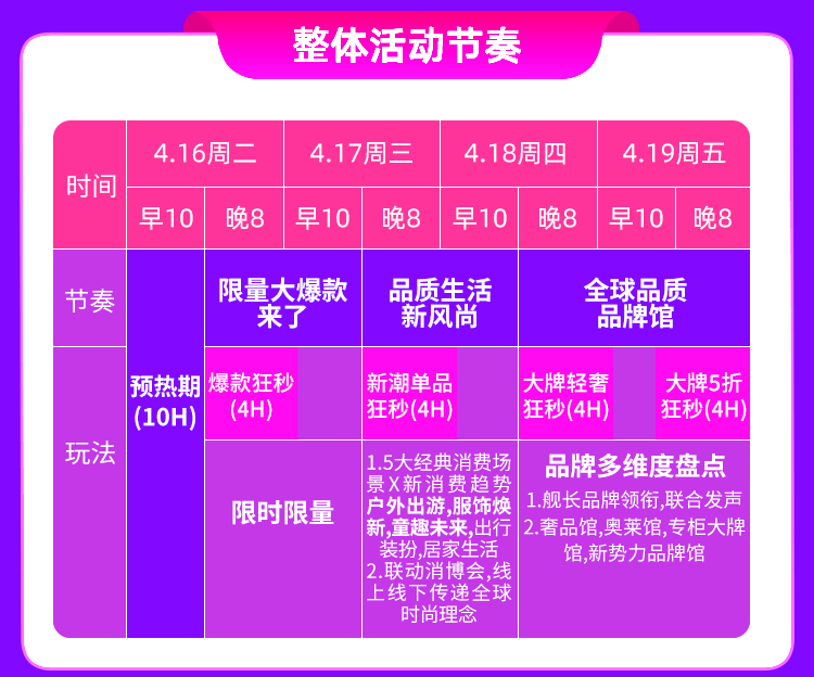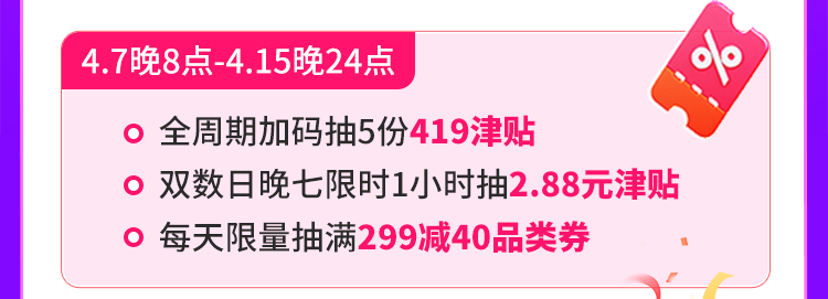 第一波(4月7日晚上8点至4月15日):全周期加码抽419元津贴,双数日晚7点限时1小时加抽3次,限量抽2.88元津贴,以及每天限量抽满299减40品类券。