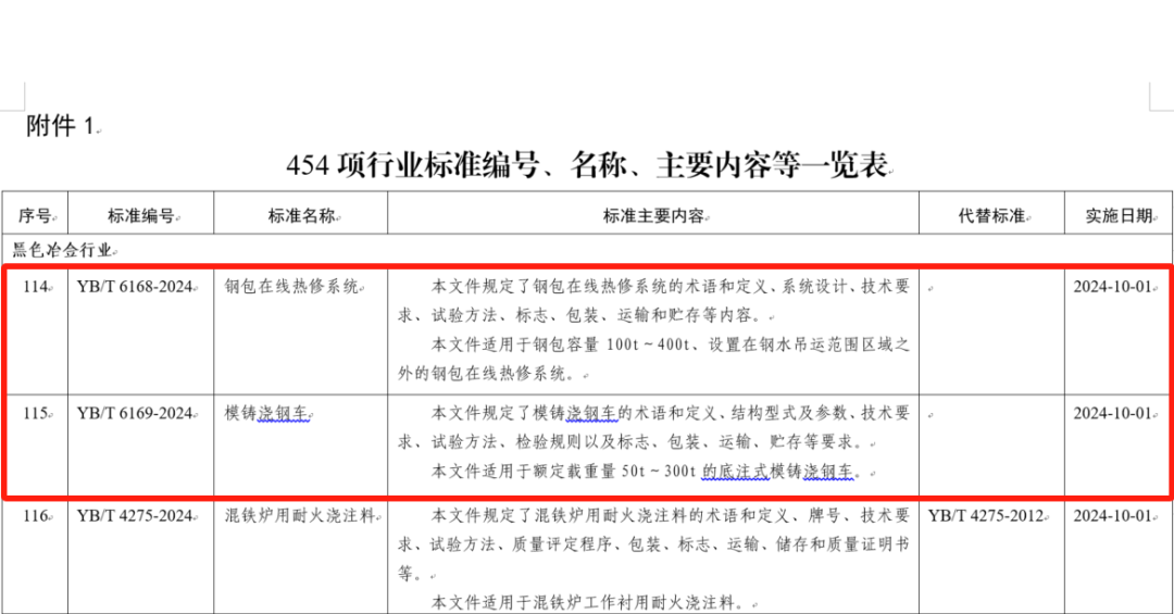 2024年3月29日,中华人民共和国工业和信息化部发布(2024年第4号)公告,由秦冶重工牵头制定的两项行业标准《钢包在线热修系统》和《模铸浇钢车》已被批准发布(标准号:YB/T6168-2024 、YB/T6169-2024),标准实施日期为2024年10月1日。