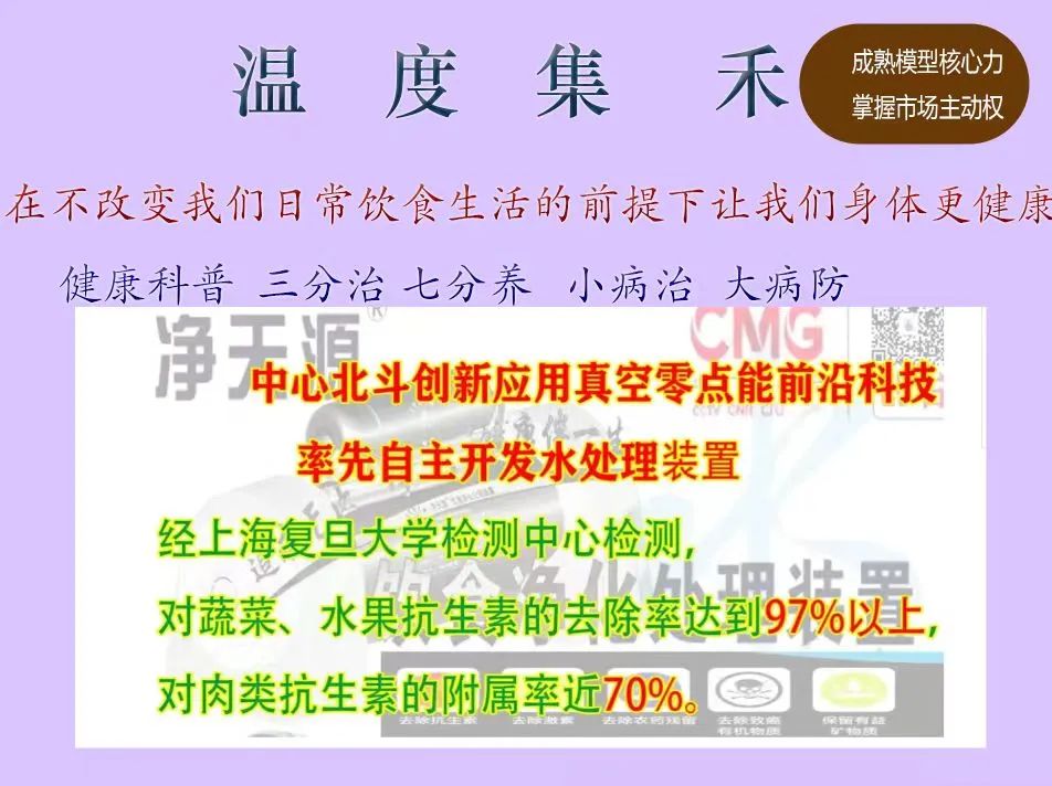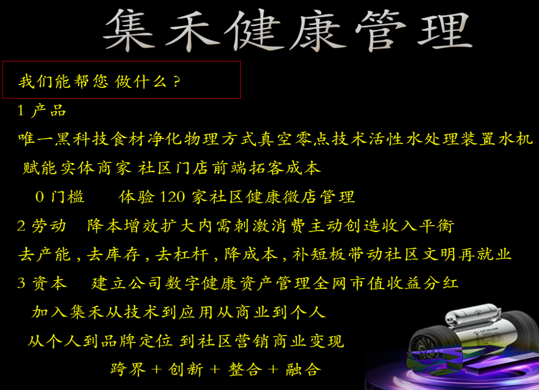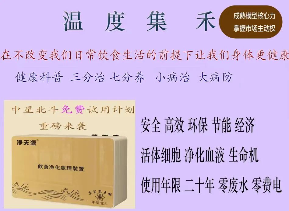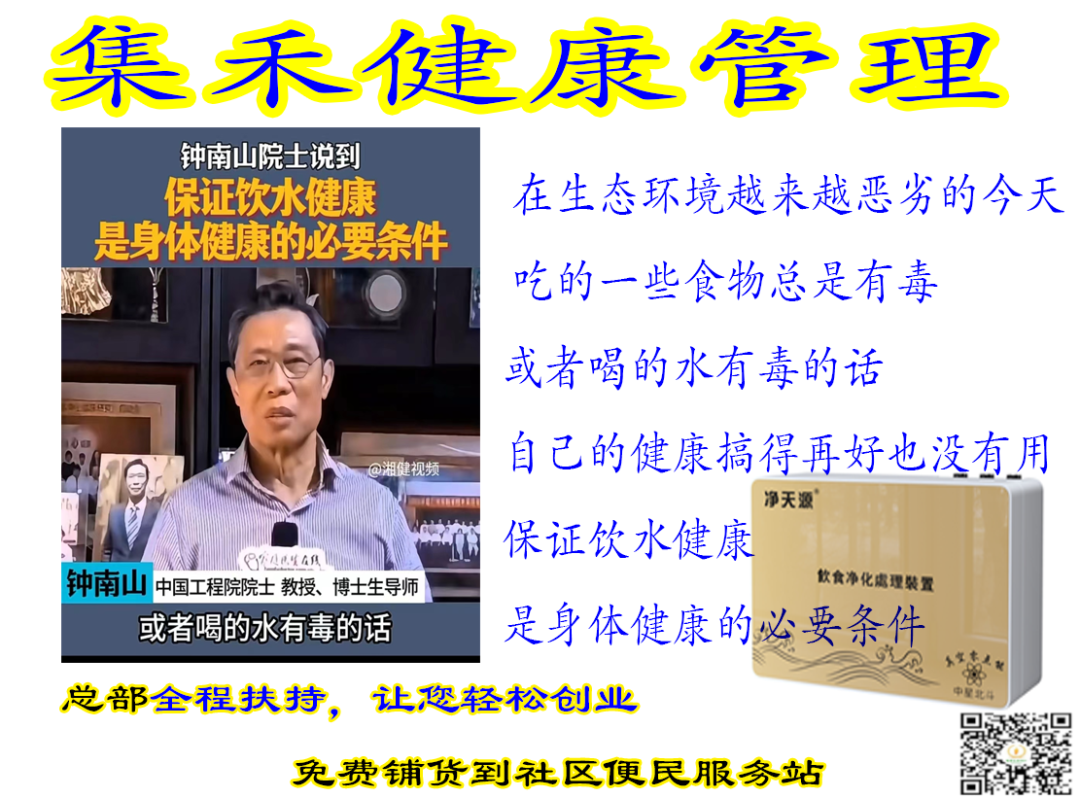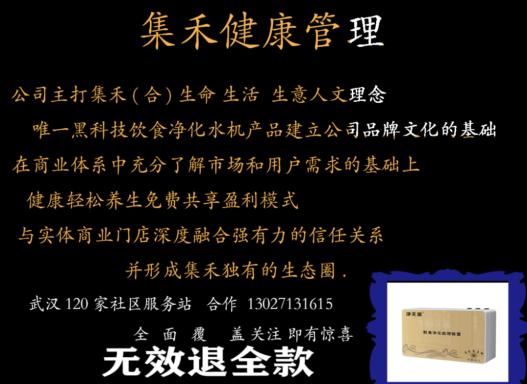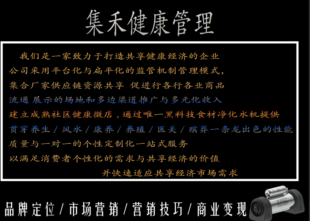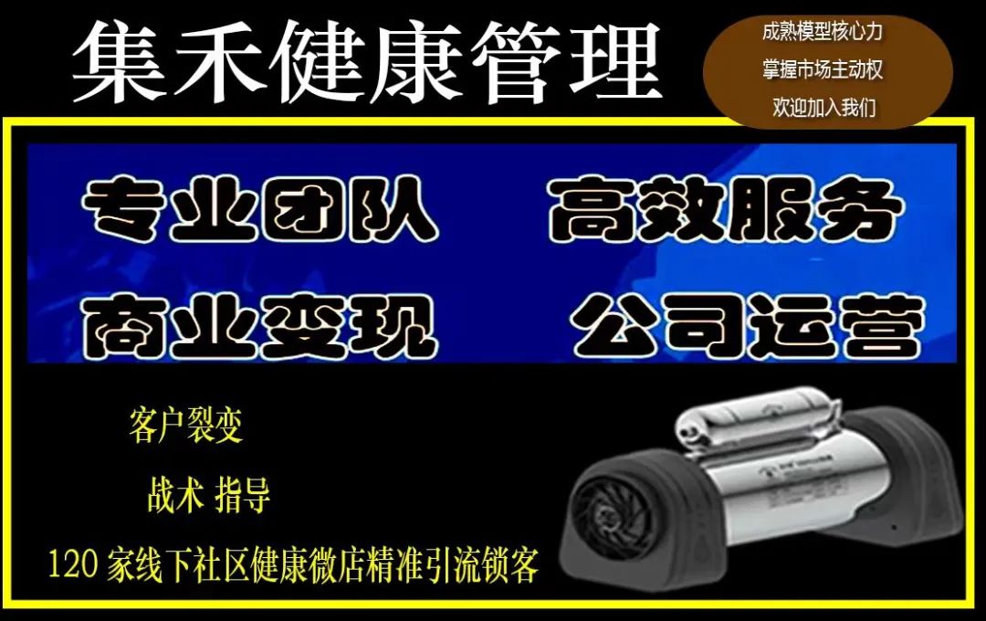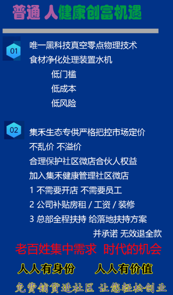 集禾健康管理中星北斗历经三年唯一黑科技物理方式真空零点技术研发成功 横空出世得到市场非常好的回馈,全国微店社区专卖相继加盟中,轻资产创业共享健康的盈利模式得到市政与卫健委领导极大支持 并在社区得到了百姓很好的拥护与信任并建立了人与人之间的情感链接,更是通科学食材净化健康的知识普及让大家形成了自发的健康意识与打水办卡意愿 ,不仅降低企业的运营成本,更快地进入市场并获得高复购利润,集禾健康管理商业创新思维是普通人轻资产健康创业成功的关键之一.