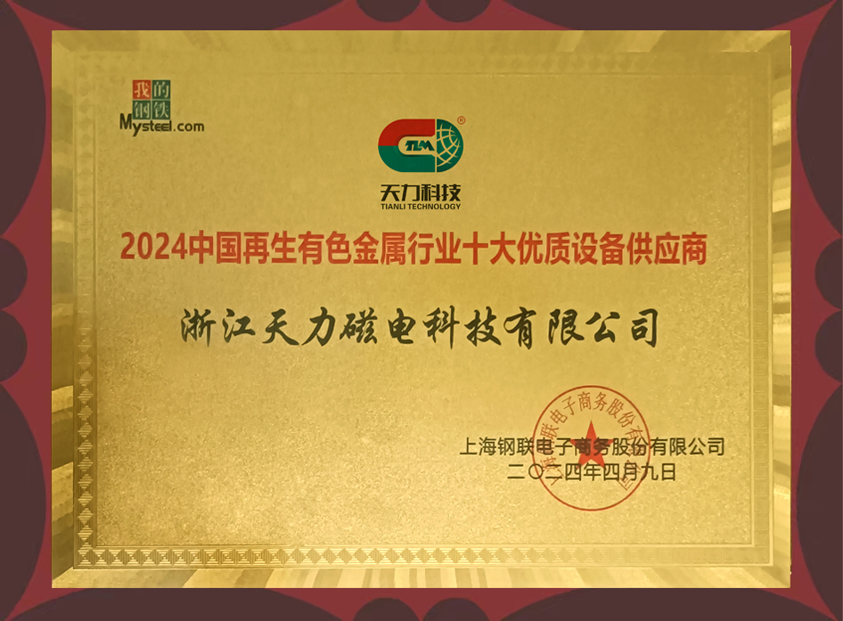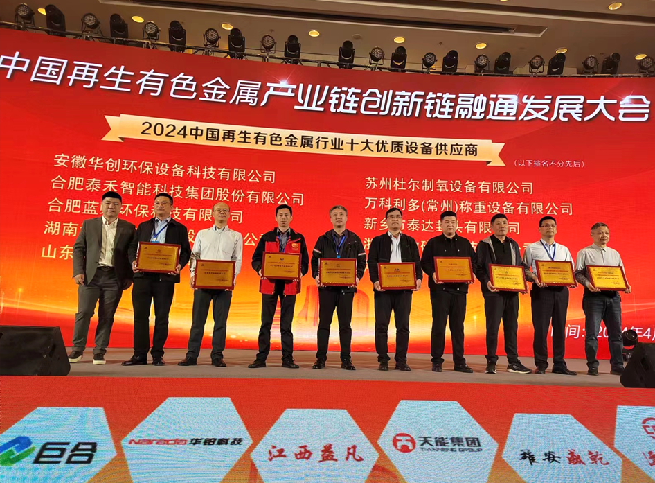 行业认可 | 天力科技荣获“2024中国再生有色金属行业十大优质设备供应商”殊荣!