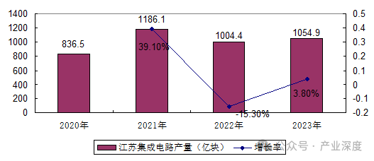 2023年,江苏省集成电路产量1054.9亿块,同比增长3.8%。同期,全国集成电路产量3514亿块,同比增长6.9%,江苏省占据全国集成电路产量为30%。