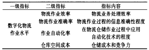 当前,物流企业数字化转型存在一些缺点:一是技术适应性不足。物流企业对数字化技术的理解和运用程度有所不足,对于新技术的接受和应用也存在问题,导致数字化转型效果不尽如人意。二是数据共享和互通难度较大。物流企业间的信息交换仍然以传统手段为主,数据共享和互通的难度较大,限制了数字化转型的进展。三是安全和隐私问题。随着数字化技术的广泛应用,数据安全和隐私保护变得尤为重要,物流企业需要加强数据安全意识和保护措施。正是基于以上缺点,我们提出了“数字化物流作业水平指标”来评价数字化转型后的物流作业水平。该指标可以帮助物流企业全面评估数字化转型的成果和效益,从物流作业效率、服务质量、成本控制和数据管理等方面了解数字化转型的影响,还可以为物流企业提供数字化转型的指导和方向,并根据指标体系中的各项指标设定具体的数字化转型目标,提出改进方案和落实措施,进一步提升数字化转型的效果和水平,推动数字化转型向更深层次发展。构建的数字化物流作业水平指标如表1所示。