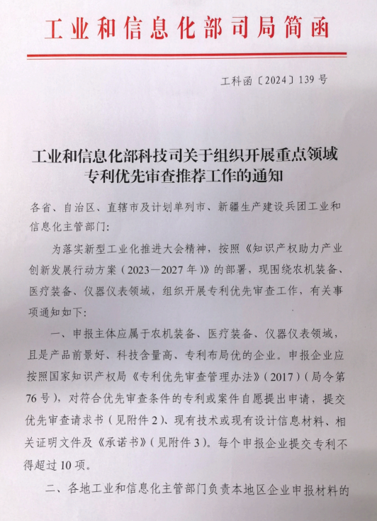 近日,工业和信息化部科技司关于组织开展重点领域专利优先审查推荐工作,其中提到:申报主体应属于农机装备、医疗装备、仪器仪表领域,且是产品前景好、科技含量高、专利布局优的企业。每个申报企业提交专利不得超过10项。将对链主企业、产业技术基础公共服务平台、工业企业知识产权运用试点、专精特新中小企业名单中企业的专利或案件申请予以优先支持。