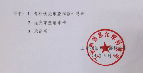 走第六个推荐理由即“其他对国家利益或者公共利益具有重大意义需要优先审查”,企业须向充分说明理由并提供相应证明材料,经工信部评估确认,这件专利IPC分类号虽然不在上述三个表的领域范围里,但是对国家利益或者公共利益具有重大意义需要优先审查,由工信部出一个说明,并盖章。