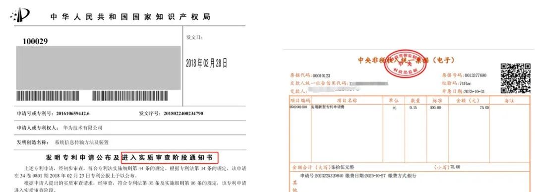 2.每件专利:如果是发明专利申请,要提供《发明专利申请进入实质审查阶段通知书》(例如下左图),纸质一份;如果是实用新型和外观专利,要提供国家知识产权局给的专利申请费的“缴费收据”(例如下右图),纸质一份。邮寄。