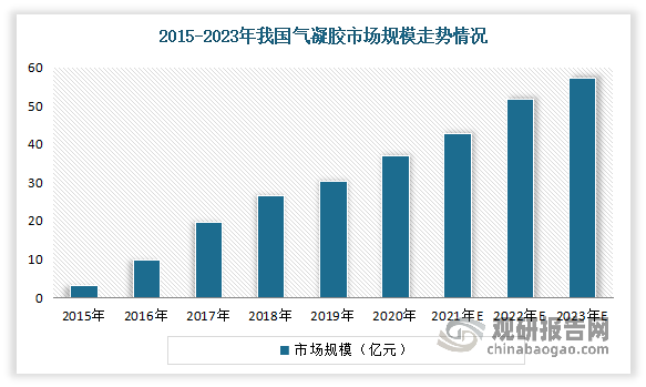 随着市场需求的不断增长,我国气凝胶市场也在不断增长。数据显示,2015-2020年,我国气凝胶市场规模由3.3亿元增加至37.16亿元,年均复合增长率高达61.1%。预计2023年我国气凝胶市场规模将达57.72亿元。