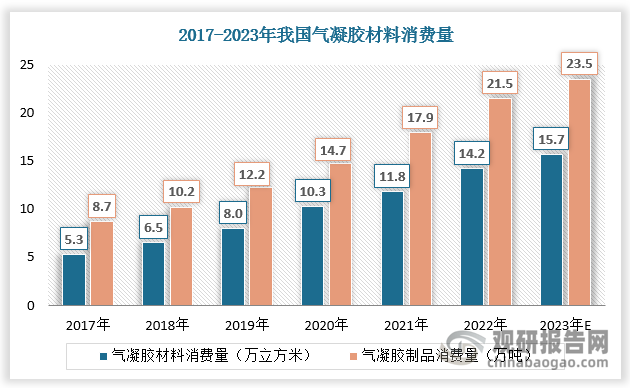 近年来随着气凝胶材料的进步和创新、产品生态效益意识的提高、以及新应用的不断拓展,行业发展显著加快,市场需求量大幅增长。数据显示,2017-2022年我国气凝胶材料消费量由5.3万立方米增长至14.2万立方米,气凝胶制品消费量由8.7万吨增长至21.5万吨,预计2023年我国气凝胶材料消费量达15.7万立方米,气凝胶制品消费量达23.5万吨。