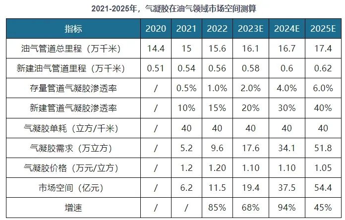 参考“十四五”现代能源体系规划,假设2021~2025年,油气管道总里程复合增速为3.7%,预计至2025年全国油气管道总里程为17.4万千米;参考中国石油管道科技研究中心发表文献数据,假设管道平均外径0.6m,保温层厚度2cm,计算得到气凝胶单耗为40立方/千米;参考中国绝热节能材料协会数据,假设2021年我国气凝胶在存量和新建管道领域渗透率分别为0.5%、10%,预计2023和2025年,气凝胶在油气管道领域的需求分别为17.6、51.8万立方,对应市场空间19.4、54.4亿元,2021~2025年复合增速达71.9%。