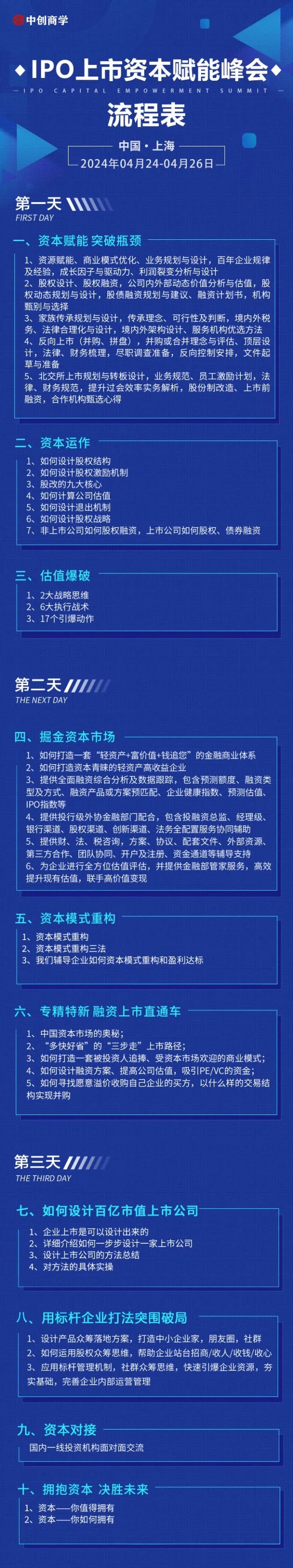 4月 24-26日上海站,中创商学蝉联各大知名投资机构,共同打造了一场三天《企业家融资-资本对接峰会》活动,活动期间,我们邀请了各行业高端龙头企业家相聚现场,互通资源,互谈融资方法,互探经商技巧。