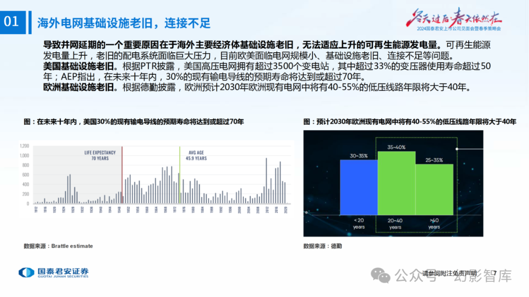 海外电网现状:投资滞后,正在进入更换周期要点:欧美地区新能源转型进程加大并网需求,而老旧的电网基础设施无法承载这一激增 的新能源并网需求,电网投资不足或成清洁能源转型的巨大障碍。