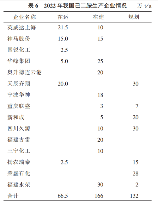 2022年,我国己二腈表观消费量约38.3万t,同比增长13.7%。己二腈下游应用比较单一,绝大部分用于加氢合成己二胺(HMDA)。2022年,我国己二胺产能66.5万t/a,产量约40.3万t,消耗己二腈约38.3万t。目前我国己二胺在建项目产能高达166万t/a,规划产能达132万t/a。我国己二胺生产企业情况详见表6。