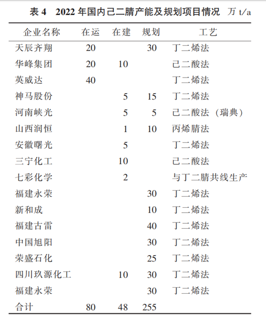表1 2022年世界己二腈主要生产企业情况