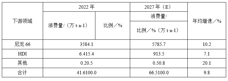 预计2022—2027年,我国HDI生产对己二胺的需求增速在7%左右,到2027年HDI行业对己二胺的市场需求将达到9.0万t左右。
