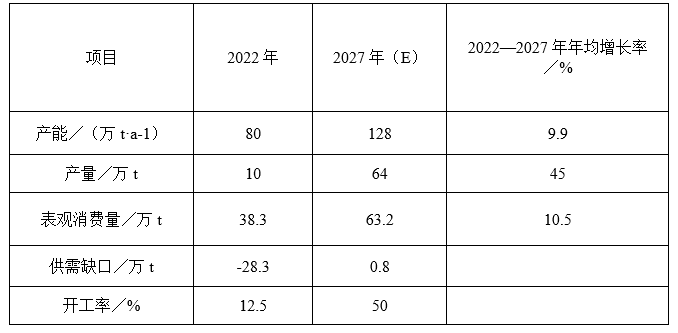 综上分析,预计到2027年国内对己二胺的市场需求将达到66.5万t左右,相应对己二腈的需求量将达到63万t左右。2022—2027年我国己二腈消费年均增长率约为10.5%左右,国内己二腈的需求仍主要取决于尼龙66的市场发展。未来我国己二腈生产不仅能满足国内市场需求,还将有部分出口,己二腈供需平衡及预测详见表8。