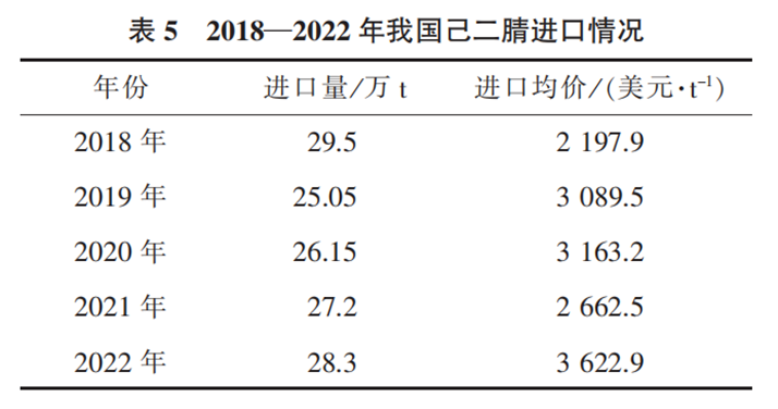 2022年我国己二腈产量约10万t,国内市场所需己二腈仍主要依赖进口。己二腈进口没有单独的海关编码,其进口包含在HS29269090(未列名腈基化合物)类别下。2022年我国己二腈进口量约28.3万t,同比增长4.1%。2018—2022年我国己二腈进口情况详见表5。
