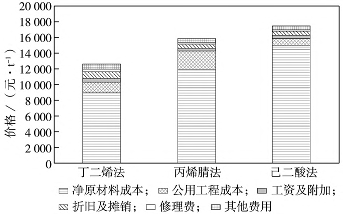 5年平均价格体系下,不同原料路线制己二腈的生产成本比较如图3所示。
