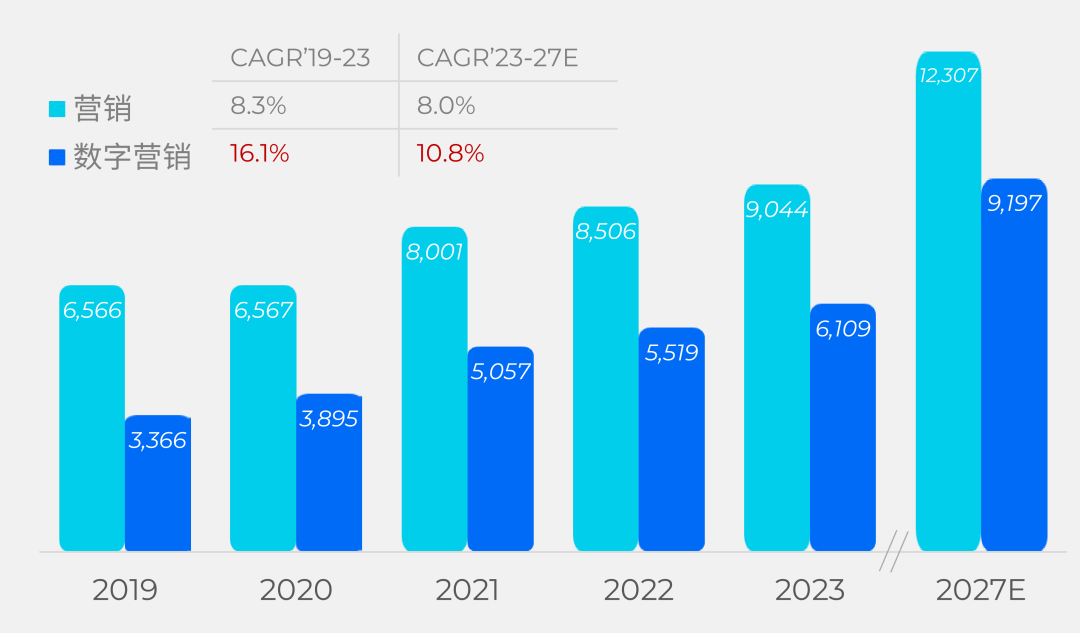 ■ 全球营销及数字营销市场规模趋势,亿美元