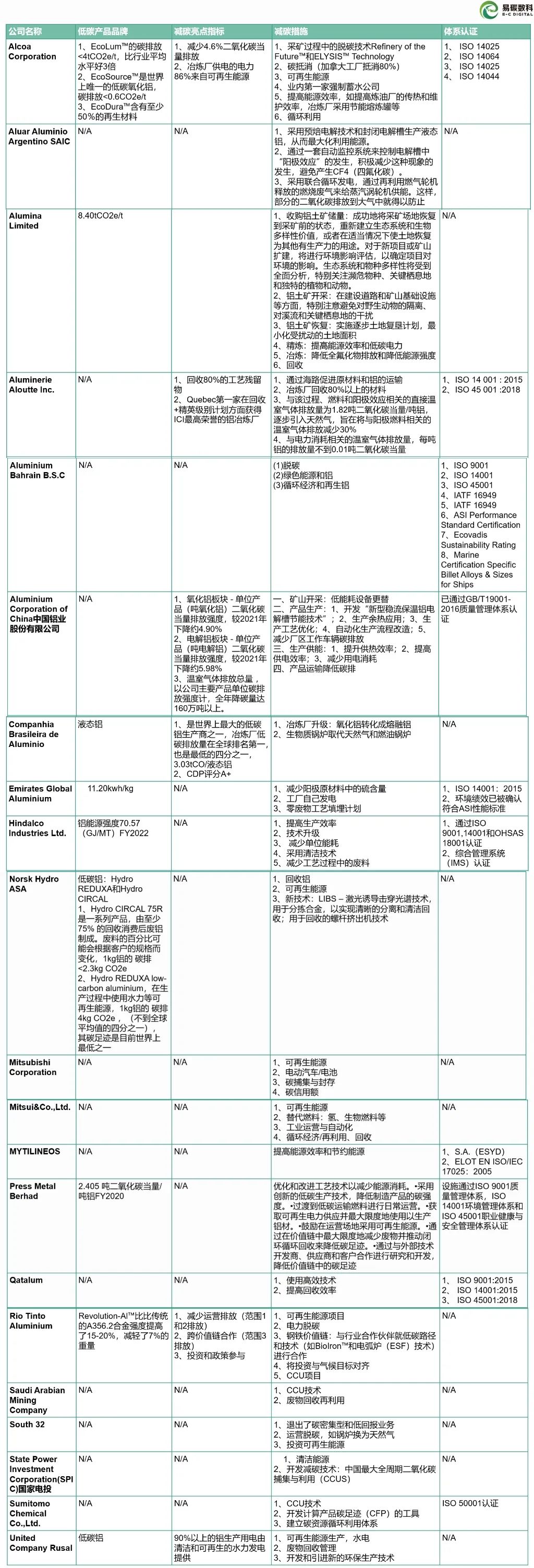 全球铝业在低碳转型的道路上已经采取了一系列重要的步骤,形成了不同的低碳品牌和实现路径。如下表所示: