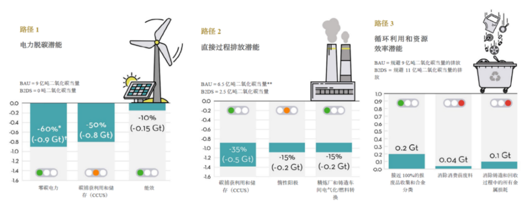 2018 年,铝行业总排放量为11亿吨二氧化碳当量。根据“照常经营”(BAU)情景预测,若不采取额外的减排措施,该行业的排放量可能在2050年攀升至16亿吨二氧化碳当量。然而,为了符合全球温室气体减排目标,限制全球平均气温升幅控制在2摄氏度之内,即所谓的“2°C优化情境”(B2DS),铝行业被要求将其排放水平大幅降低至2.5亿吨二氧化碳当量。为了应对这一挑战并同时满足全球对铝材料不断增长的需求,国际铝业协会在满足日益增长的需求的同时,确定了三种减排路径: