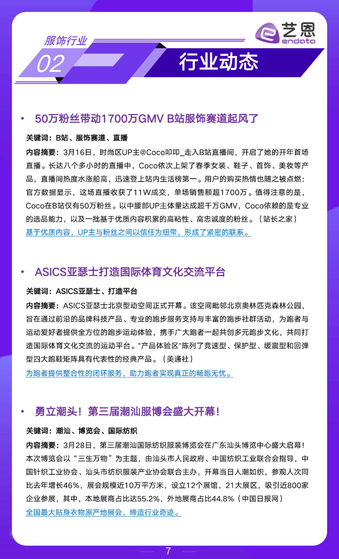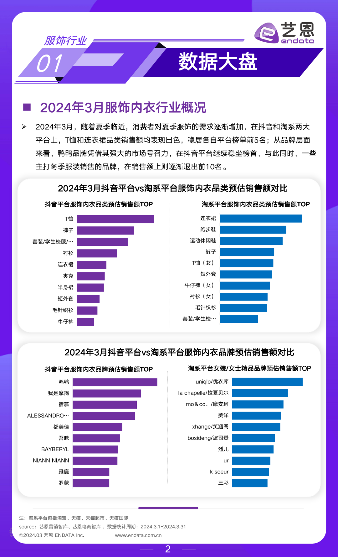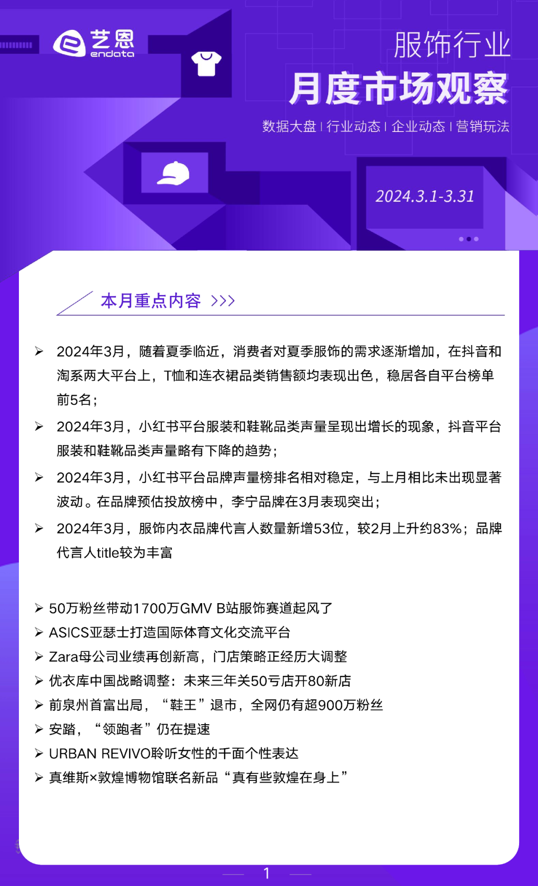 艺恩数据服饰行业月度市场洞察,围绕数据大盘、行业动态、企业动态和营销玩法展开,为大家提供参考。2024年3月重点内容如下: