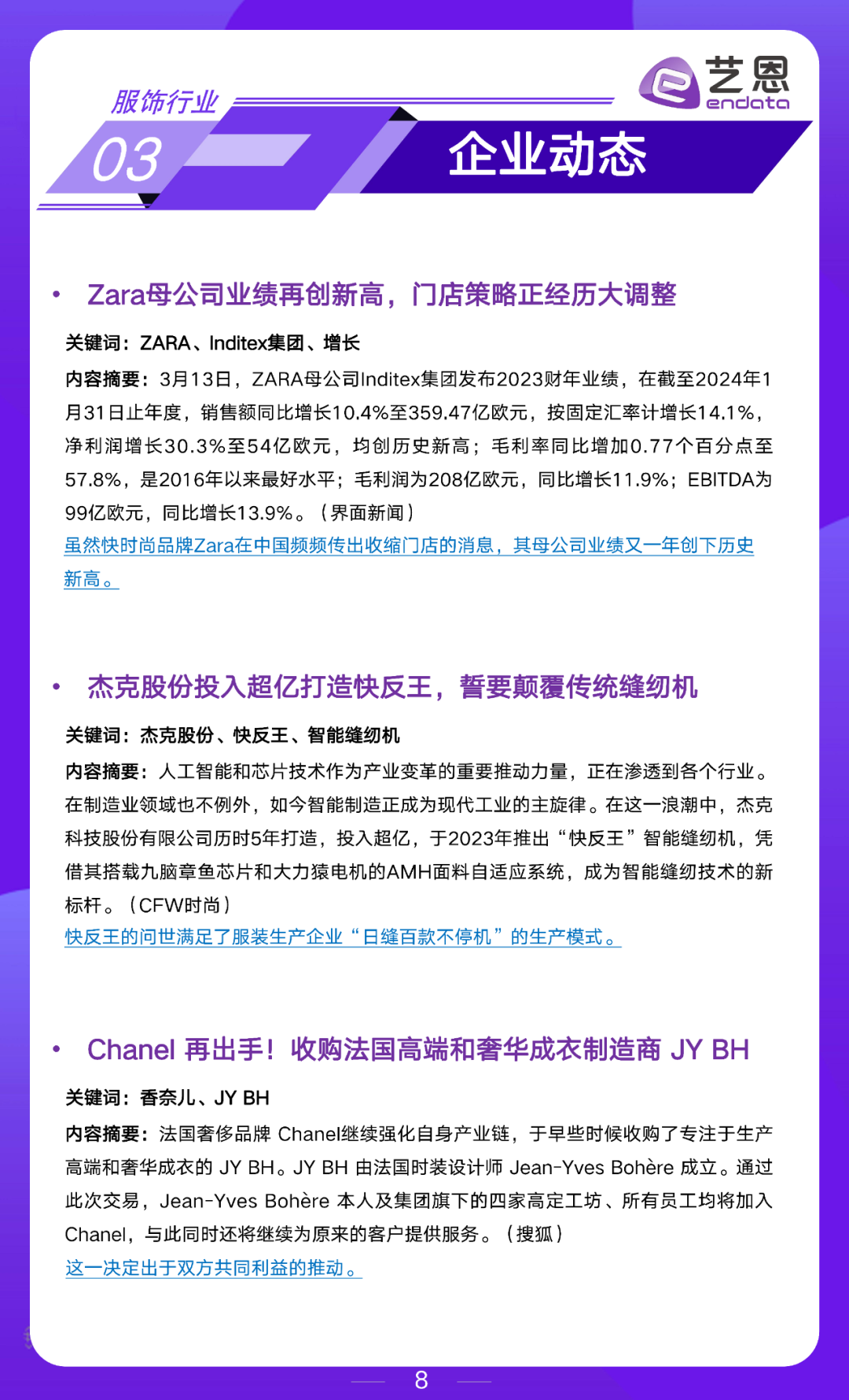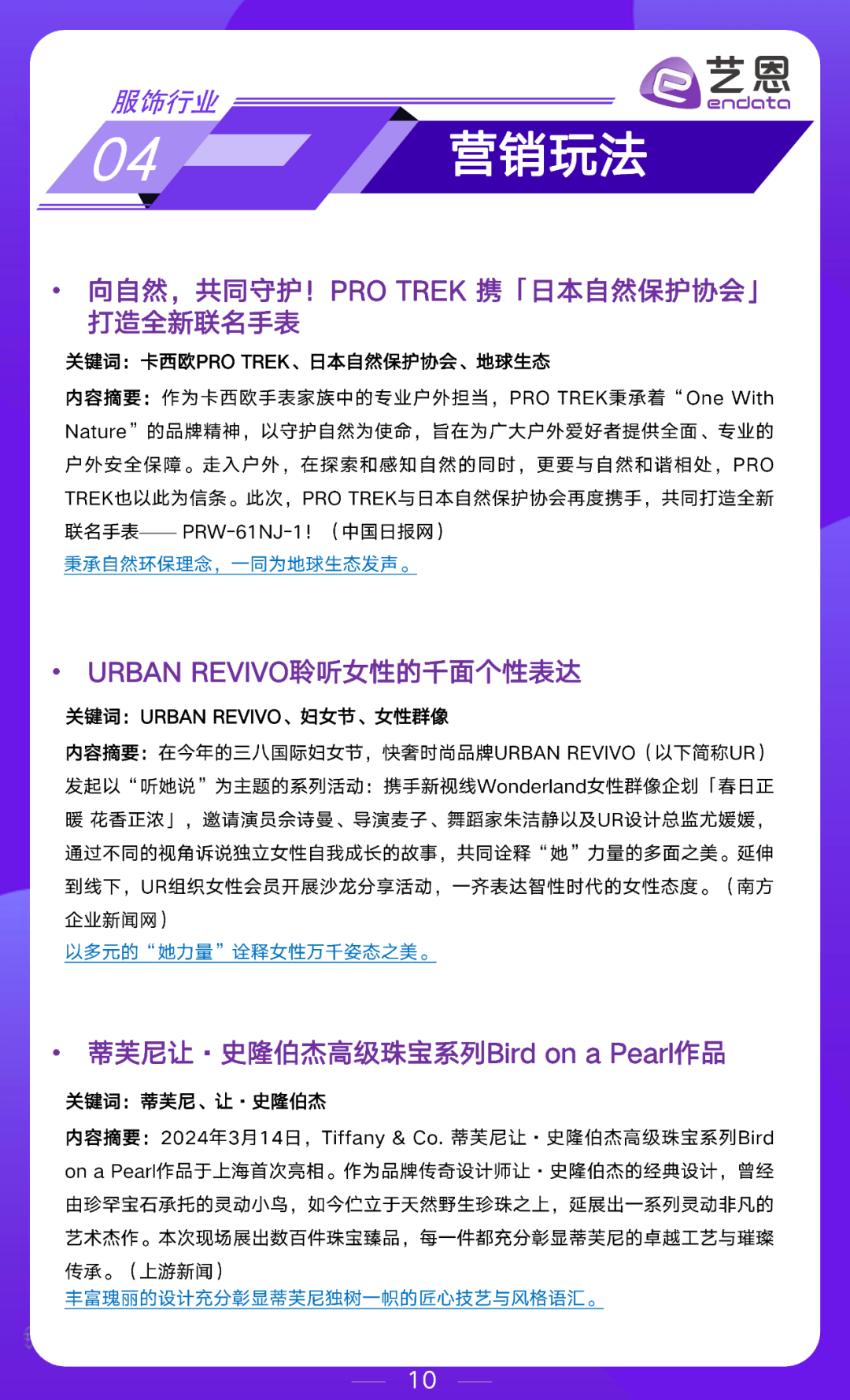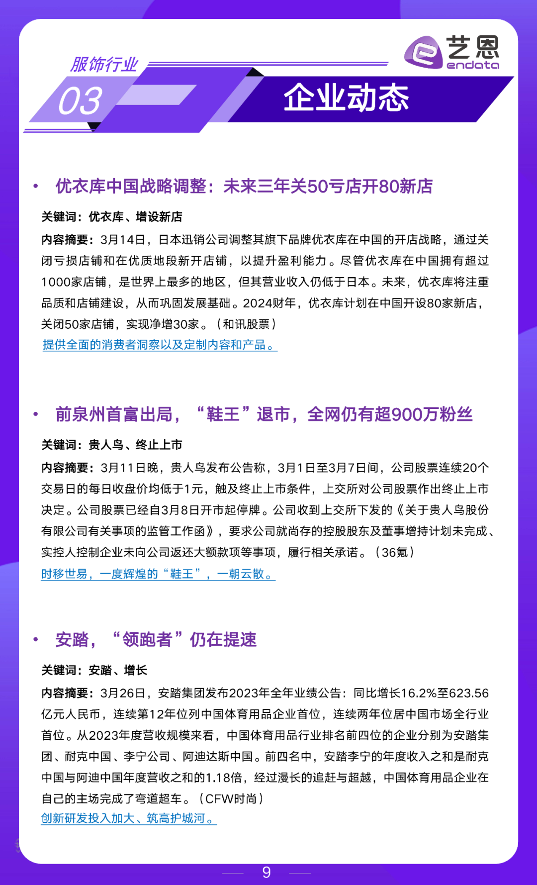 艺恩数据服饰行业月度市场洞察,围绕数据大盘、行业动态、企业动态和营销玩法展开,为大家提供参考。2024年3月重点内容如下: