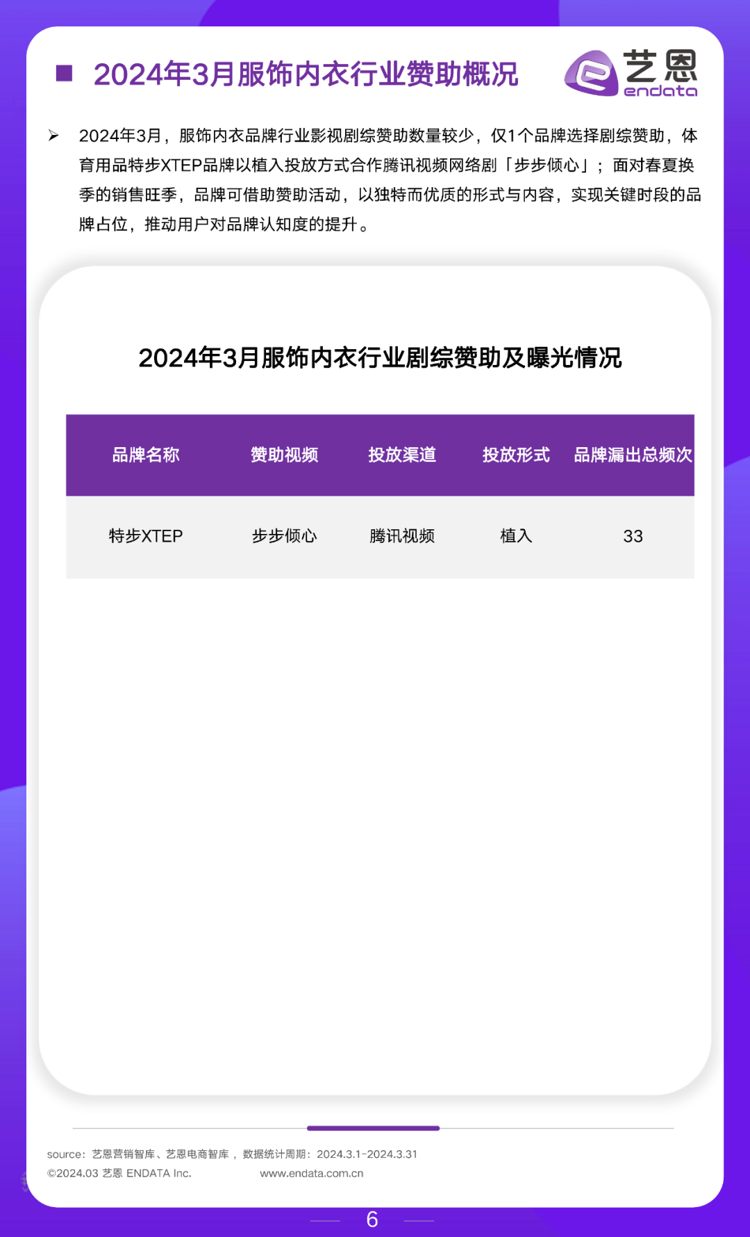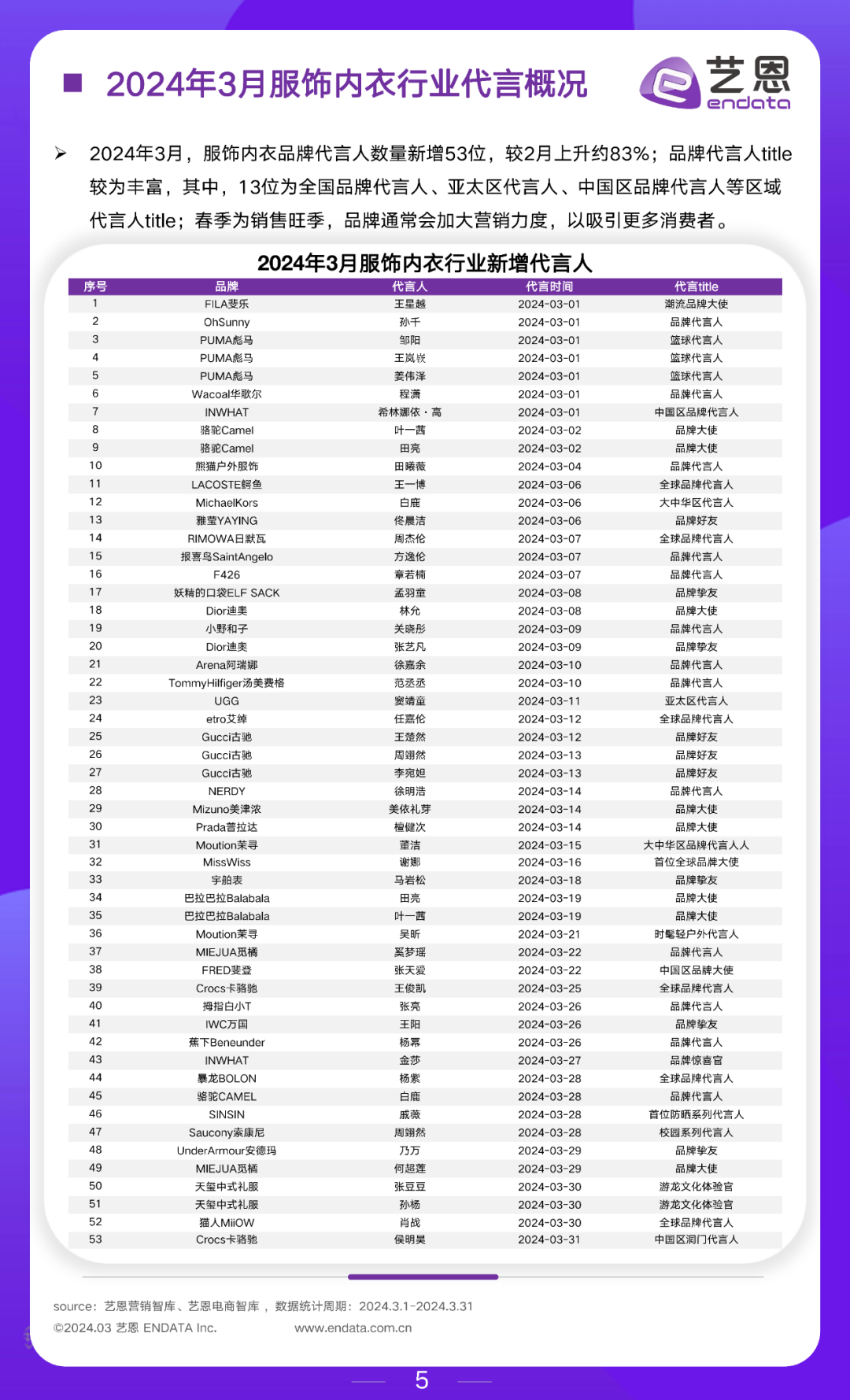 2024年3月,服饰内衣品牌代言人数量新增53位,较2月上升约83%;品牌代言人title较为丰富
